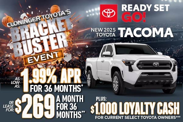 *1.99% APR for 36 monthly payments of $28.64 for every $1,000 financed. Terms available on approved credit through participating Toyota dealers and Southeast Toyota Finance. For only very well qualified customers. No down payment required if qualified for advertised offer. **Lease a new 2025 Toyota Tacoma Model 7146 for $269 per month for 36 months with $3,999 Due At Signing. No security deposit required, subject to credit approval through Southeast Toyota Finance. 36 months lease, 12,000 miles per year. Not all customers qualify. Cannot be combined with any other offers, see dealer for complete details. ***$1,000 Tacoma Loyalty Cash offer entitles current Tacoma/Tundra/4Runner/Sequoia/Land Cruiser owners to $1,000 on the purchase or lease of a new 2024, 2025, or 2026 Tacoma (Gas Models). This program applies to all Tacoma models, except Trail Hunter and TRD Pro models. Must lease or finance through SETF. Offer valid only at participating dealers in AL, FL, GA, NC and SC. Limit one per customer. No trade-in required. This offer is not transferable in any way. Vehicle must be retailed by 3/31/2026. Offers require Tier 1 approved credit through Southeast Toyota Finance. All offers exclude tax, tag, registration, and title and $899 dealer fee. See dealer for complete details and exclusions. Images for display purposes only. Expires 3/31/2026.
