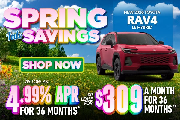 *4.99% APR for 36 monthly payments of $29.97 for every $1,000 financed. Terms available on approved credit through participating Toyota dealers and Southeast Toyota Finance. For only very well qualified customers. No down payment required if qualified for advertised offer. **Lease a new 2026 Toyota Rav4 Hybrid Model 4521 for $309 per month for 36 months with $3,999 Due At Signing. No security deposit required, subject to credit approval through Southeast Toyota Finance. 36 months lease, 12,000 miles per year. Not all customers qualify. Cannot be combined with any other offers, see dealer for complete details. Offers require Tier 1 approved credit through Southeast Toyota Finance. 720 Beacon score or higher required. All offers exclude tax, tag, registration, and title and $899 dealer fee. See dealer for complete details and exclusions. Images for display purposes only. Expires 4/30/2026.