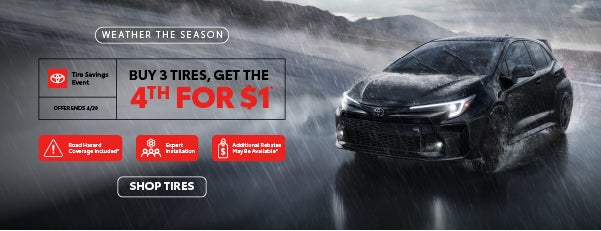 *Restrictions apply. Offer valid on participating brands. See participating Toyota dealer for complete details. Replacement tires only. Tires must be purchased by April 30, 2026, and dealer-installed by May 7, 2026. Three tires at regular price, fourth tire for one dollar. Fourth tire must be of equal or lesser value. Excludes mounting & balancing, sales tax, shop supplies, tire disposal, & other applicable taxes. Excludes previous purchases. Toyota & Scion vehicles only. Offer only available at participating Toyota dealers 4/1/26–4/30/26. Prototype shown with options. Professional driver on closed course. Do Not Attempt.