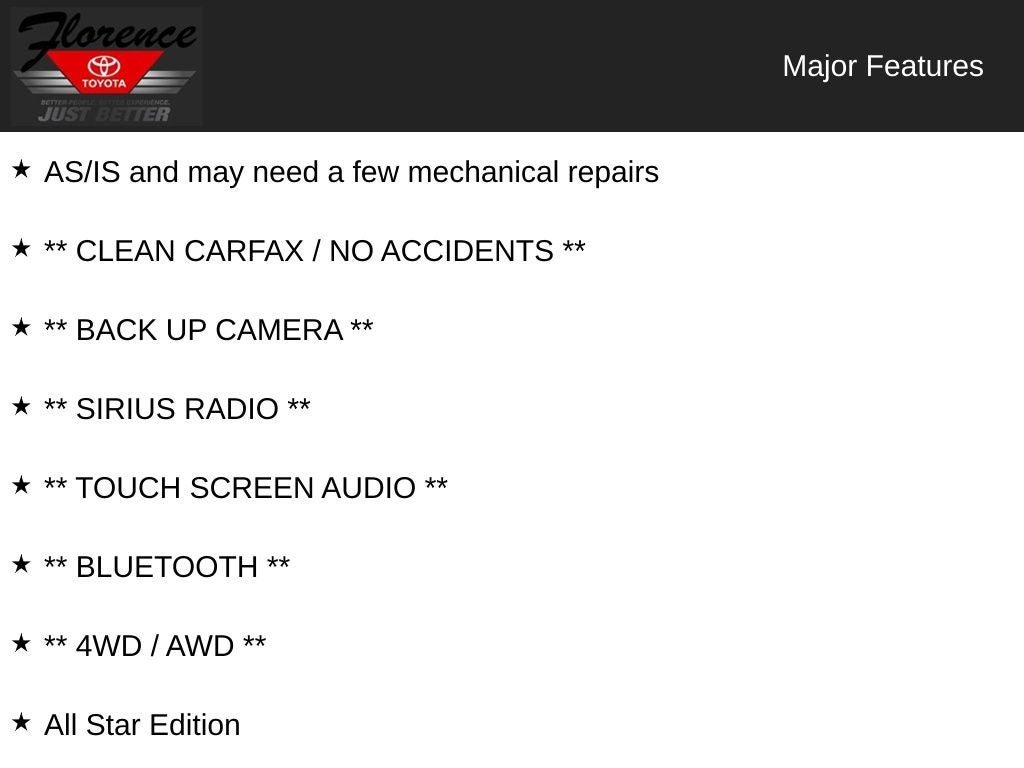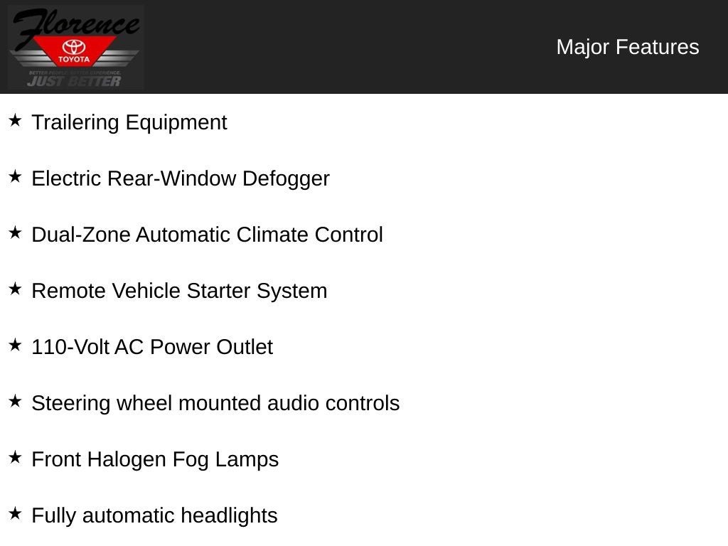 - All Star Edition: Rear Vision Camera with Dynamic Guide Lines; Manual Tilt/telescoping Steering Column; Remote Vehicle Starter System; Trailering Equipment; 110-Volt AC Power Outlet; Front Halogen Fog Lamps; Electric Rear-Window Defogger; Dual-Zone Automatic Climate Control; 10-Way Power Driver Seat Adjuster; AM/FM 8" Diagonal Color Touch Screen Radio