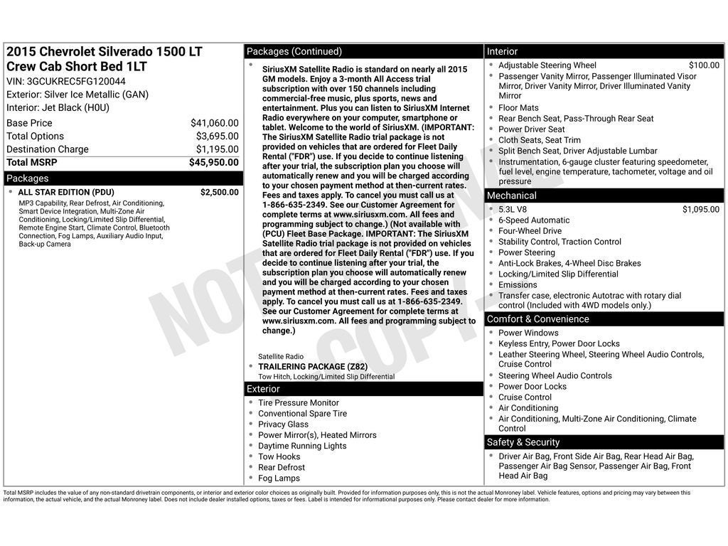 - SiriusXM Satellite Radio is standard on nearly all 2015 GM models. Enjoy a 3-month All Access trial subscription with over 150 channels including commercial-free music, plus sports, news and entertainment. Plus you can listen to SiriusXM Internet Radio everywhere on your computer, smartphone or tablet. Welcome to the world of SiriusXM. (IMPORTANT: The SiriusXM Satellite Radio trial package is not provided on vehicles that are ordered for Fleet Daily Rental ("FDR") use. If you decide to continue listening after your trial, the subscription plan you choose will automatically renew and you will be charged according to your chosen payment method at then-current rates. Fees and taxes apply. To cancel you must call us at 1-866-635-2349. See our Customer Agreement for complete terms at www.siriusxm.com. All fees and programming subject to change.) (Not available with (PCU) Fleet Base Package. IMPORTANT: The SiriusXM Satellite Radio trial package is not provided on vehicles that are ordered for Fleet Daily Rental ("FDR") use. If you decide to continue listening after your trial, the subscription plan you choose will automatically renew and you will be charged according to your chosen payment method at then-current rates. Fees and taxes apply. To cancel you must call us at 1-866-635-2349. See our Customer Agreement for complete terms at www.siriusxm.com. All fees and programming subject to change.)