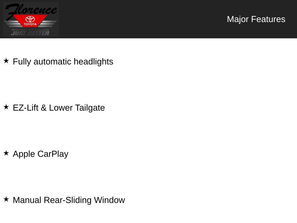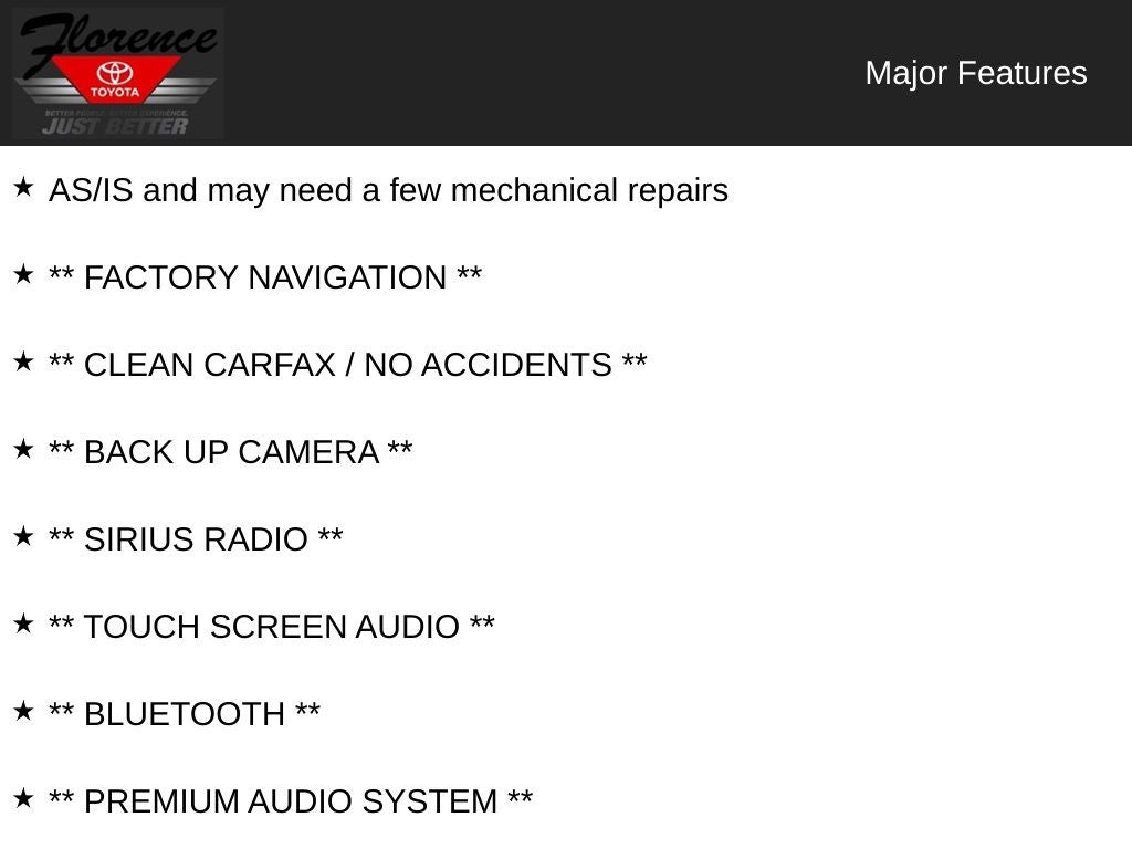 At Florence Toyota come see how our USED CARS are JUST BETTER . We offer the following benefits: Lifetime Power Train (Some exclusions apply), 1st Year Maintenance, $500 Additional Trade In Appraisal, 72 Hour Vehicle Exchange Program, Yearly Vehicle Appraisal & Safety Inspection, VIP Loyalty Program, Routine Express Service, Courtesy Service Shuttle, Express Buying Service. Also, as an added benefit we will buy your vehicle even if you don't buy ours!! Call today (866)830-0793or visit us at www.florencetoyota.com *Customer must trade-in a vehicle to receive $1,000 Trade Assist credit that is included in the online price. **Financing must be provided by a third-party lender using this dealership’s assistance for Customer to receive $1,000 Financing Assist credit that is included in the online price. See dealer for complete details.