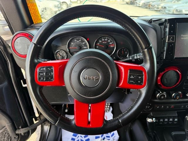 Accent Stitching, Alpine 9-Speaker w/All Weather Subwoofer, Black/Chrome Screws Fuel Filler Door, Chrome/Leather Wrapped Shift Knob, Class II Receiver Hitch, Connectivity Group, Hood w/Power Dome, Jeep Trail Rated Kit, Leather Trimmed Bucket Seats, Leather Wrapped Steering Wheel, Low Gloss Black Wrangler Decal, Max Tow Package, MOPAR Slush Mats, Premium Black Sunrider Soft Top, Premium EVIC Message Center, Quick Order Package 23J Rubicon Hard Rock, Quick Order Package 24J Rubicon Hard Rock, Red Front & Rear Tow Hooks, Red Trail Rated Badge, Remote USB Port, Rubicon Hard Rock Package, Rubicon Hood Decal, Silver Interior Accents, Steel Front Bumper, Steel Rear Bumper, Tire Pressure Monitoring Display, Trailer Tow w/4-Pin Connector Wiring, Uconnect Voice Command w/Bluetooth®, Vehicle Information Center, Wheels: 17 x 7.5 Polished Semi-Gloss Black.