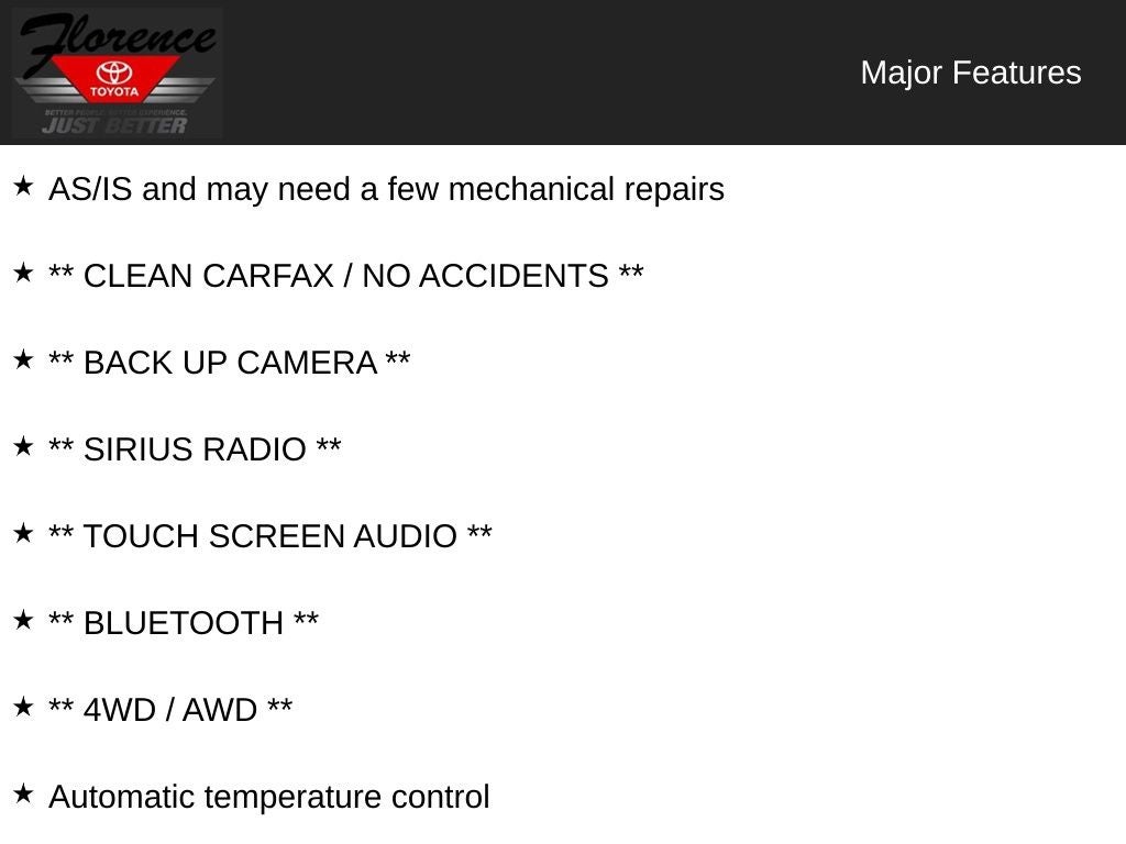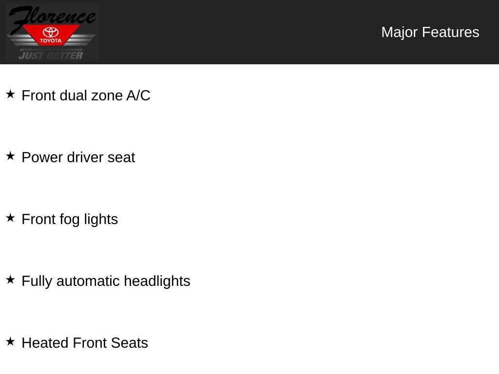 At Florence Toyota come see how our USED CARS are JUST BETTER . We offer the following benefits: Lifetime Power Train (Some exclusions apply), 1st Year Maintenance, $500 Additional Trade In Appraisal, 72 Hour Vehicle Exchange Program, Yearly Vehicle Appraisal & Safety Inspection, VIP Loyalty Program, Routine Express Service, Courtesy Service Shuttle, Express Buying Service. Also, as an added benefit we will buy your vehicle even if you don't buy ours!! Call today (866)830-0793or visit us at www.florencetoyota.com *Customer must trade-in a vehicle to receive $1,000 Trade Assist credit that is included in the online price. **Financing must be provided by a third-party lender using this dealership’s assistance for Customer to receive $1,000 Financing Assist credit that is included in the online price. See dealer for complete details.