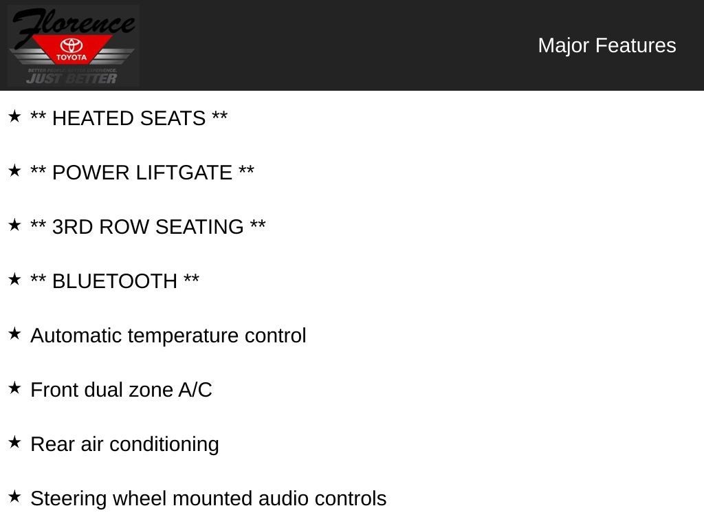 At Florence Toyota come see how our USED CARS are JUST BETTER . We offer the following benefits: Lifetime Power Train (Some exclusions apply), 1st Year Maintenance, $500 Additional Trade In Appraisal, 72 Hour Vehicle Exchange Program, Yearly Vehicle Appraisal & Safety Inspection, VIP Loyalty Program, Routine Express Service, Courtesy Service Shuttle, Express Buying Service. Also, as an added benefit we will buy your vehicle even if you don't buy ours!! Call today (866)830-0793or visit us at www.florencetoyota.com *Customer must trade-in a vehicle to receive $1,000 Trade Assist credit that is included in the online price. **Financing must be provided by a third-party lender using this dealership’s assistance for Customer to receive $1,000 Financing Assist credit that is included in the online price. See dealer for complete details.