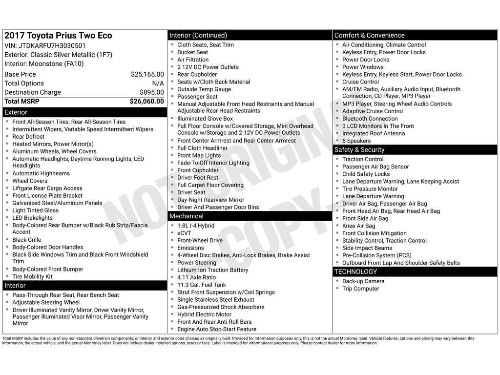 Experience efficiency and reliability with this 2017 Toyota Prius Two Eco, now available in Florence, SC. This fuel-sipping hybrid combines a smooth 4-cylinder, 1.8L Full Hybrid Electric (FHEV) powertrain with front-wheel drive for exceptional gas mileage and confident daily driving. CARFAX shows a single owner, reflecting careful maintenance and a clean history you can trust. Step inside to enjoy a comfortable, tech-savvy cabin: Hands-Free Bluetooth® keeps your calls and music seamless, Automatic Climate Control maintains the perfect temperature, and the Back-Up Camera gives added confidence when parking or reversing. Adaptive Cruise Control enhances highway travel by automatically adjusting speed to maintain a safe distance from traffic — ideal for long commutes or road trips. This Toyota Prius Two Eco blends practicality with modern safety features and smart efficiency, delivering a low-cost-to-own experience without sacrificing comfort. Whether you prioritize fuel economy, dependable performance, or advanced driver assists, this model checks every box. Located in Florence, SC, this Toyota Prius is priced to sell — offering the best value in the area for a one-owner hybrid with these features. Don't miss the chance to own a well-maintained, feature-packed hybrid that delivers long-term savings and everyday enjoyment. Contact us today to schedule a test drive in Florence and see why this 2017 Toyota Prius Two Eco is the smart buy for driving forward with confidence.