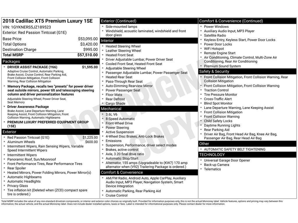 Driver Assist Package: Automatic Safety Belt Tightening; Automatic Parking Assist; Forward and Reverse Automatic Braking; Automatic Collision Braking; Adaptive Full-Speed Range Cruise Control Premium Luxury Package 1SE: Cadillac User Experience Radio with Embedded Navigation; Front and Rear Park Assist; Body-Color Heated Power-Adjustable Outside Mirrors; Low Speed Forward Automatic Braking; Performance Suspension; P235/55R20 AS BW H-Rated Tires; 155 Amp Alternator **Equipment listed is based on original vehicle build and subject to change. Please confirm the accuracy of the included equipment by calling the dealer prior to purchase.**