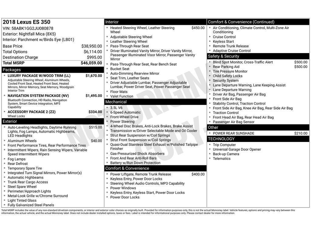 2018 Lexus ES 350 Base - Smooth V6 Performance in Florence, SC Impeccably maintained 2018 Lexus ES 350 Base with a responsive 3.5L V6 gasoline engine and efficient front-wheel drive, located in Florence, SC. This luxury sedan blends refined comfort, reliable performance, and advanced features for drivers who value a quiet, composed ride and premium interior appointments. Key features include Automatic Climate Control for personalized comfort, Adaptive Cruise Control for relaxed highway travel, and a Back-Up Camera to aid parking and enhance safety. Stay connected with Hands-Free Bluetooth® connectivity, and enjoy extra comfort on chilly mornings with a Heated Steering Wheel. The smooth-shifting automatic transmission partners with the V6 to deliver confident acceleration and composed handling. Inside, the cabin showcases quality materials, supportive seating, and a thoughtful layout focused on driver convenience and passenger comfort. Safety and driver-assistance technologies help provide peace of mind during daily commutes and longer trips. With detailed maintenance records and a clean history, this Lexus ES 350 is ready to serve as a dependable, stylish sedan for years to come. Located in Florence, SC, this 2018 Lexus ES 350 Base is ideal for buyers seeking Lexus luxury without compromise. Contact us to arrange a test drive and experience the refined performance and comfort firsthand.