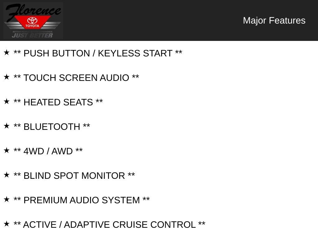 At Florence Toyota come see how our USED CARS are JUST BETTER . We offer the following benefits: Lifetime Power Train (Some exclusions apply), 1st Year Maintenance, $500 Additional Trade In Appraisal, 72 Hour Vehicle Exchange Program, Yearly Vehicle Appraisal & Safety Inspection, VIP Loyalty Program, Routine Express Service, Courtesy Service Shuttle, Express Buying Service. Also, as an added benefit we will buy your vehicle even if you don't buy ours!! Call today (866)830-0793or visit us at www.florencetoyota.com *Customer must trade-in a vehicle to receive $1,000 Trade Assist credit that is included in the online price. **Financing must be provided by a third-party lender using this dealership’s assistance for Customer to receive $1,000 Financing Assist credit that is included in the online price. See dealer for complete details.