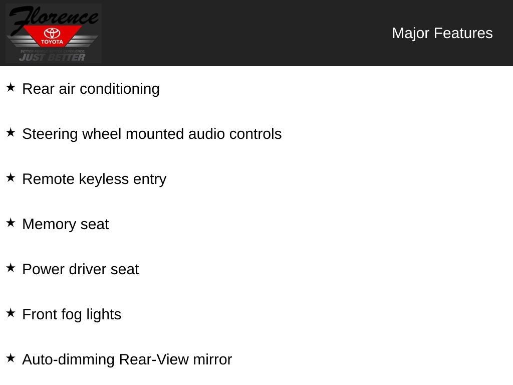 At Florence Toyota, we are committed to providing our customers with the best possible experience. Come see how our USED CARS are JUST BETTER. We offer the following benefits: Lifetime Power Train (Some exclusions apply), 1st Year Maintenance, $500 Additional Trade In Appraisal, 72 Hour Vehicle Exchange Program, Yearly Vehicle Appraisal & Safety Inspection, VIP Loyalty Program, Routine Express Service, Courtesy Service Shuttle, Express Buying Service. Also, as an added benefit we will buy your vehicle even if you don't buy ours!! Call today (866)830-0793 or visit us at www.florencetoyota.com *Customer must trade-in a vehicle to receive $1,000 Trade Assist credit that is included in the online price. **Financing must be provided by a third-party lender using this dealership's assistance for Customer to receive $1,000 Financing Assist credit that is included in the online price. See dealer for complete details.