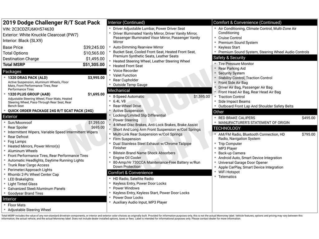 1320 Plus Group: Child Seat Upper Tether Anchorages; Power Tilt/telescope Steering Column; Door Trim Panel with Ambient Lighting; Front Passenger Seat Belt Alert; Front Passenger Seat; Center Rear 3-Point Seat Belt; Bright Pedals; Heated Steering Wheel; Nappa/Alcantara Performance Seats; Rear 60/40 Folding Seat; Black-Edged Premium Floormats 1320 Drag Pack: Dodge Performance Pages; Drag Mode Suspension; Dodge Alcantara Performance Steering Wheel; 275/40R20 102W Drag Radial Tires; 1 Year NMCA/NHRA Membership; Adaptive Damping Suspension; Drag Pak Illuminated Air Catcher Headlamp; 20" X 9.5" Low Gloss Black Drag Wheels; Drag Pak Fender Badge; Driver Floor Mat; Front Passenger Seat Belt Delete; Unspecified Tire Brand; Transbrake; Speed Limited Engine Controller; Passenger Seat Delete; Drag Pak I/P Badge; Drag Mode Performance Pages Quick Order Package 24G R/T Scat Pack: 3.09 Rear Axle Ratio Power Sunroof Adaptive Damping Suspension Uconnect 4C Navigation with 8.4" Display SRT Performance Spoiler Red Brake Calipers **Equipment listed is based on original vehicle build and subject to change. Please confirm the accuracy of the included equipment by calling the dealer prior to purchase.**