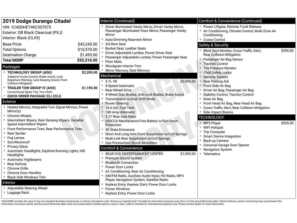Well-maintained and inspected, this Citadel delivers the dependability you expect from Dodge paired with upscale amenities. Whether you need a capable daily driver or a tow-ready SUV with upscale touches, this Dodge Durango checks the boxes. Stop by in Florence, SC to test drive and see why this 2019 Dodge Durango Citadel offers the best price and exceptional value in the area. Contact us today to schedule your appointment.