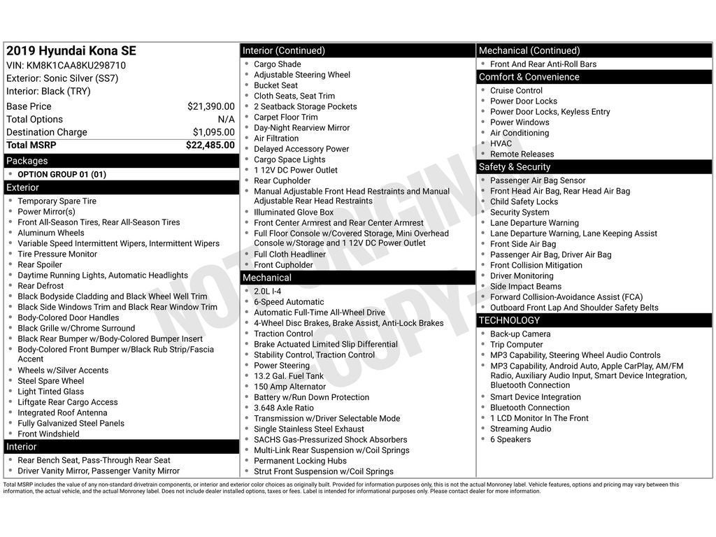 Lane Keep Assist in it helps maintain safe driving by gently steering to stay within the lane. See what's behind you with the back up camera on this small suv. Bluetooth® technology is built into this 2019 Hyundai Kona , keeping your hands on the steering wheel and your focus on the road. This vehicle offers Apple CarPlay for seamless connectivity. This unit offers Android Auto for seamless smartphone integration. This Hyundai Kona has a 4 Cyl, 2.0L high output engine. Maintaining a stable interior temperature in it is easy with the climate control system. Quickly unlock the Hyundai Kona with keyless entry. This small suv shines with an exquisite metallic silver exterior finish. This Hyundai Kona has four wheel drive capabilities. This Hyundai Kona is equipped with a gasoline engine. Easily set your speed in this small suv with a state of the art cruise control system. Increase or decrease velocity with the touch of a button.