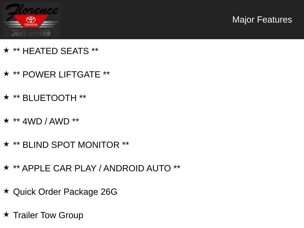At Florence Toyota come see how our USED CARS are JUST BETTER. We offer the following benefits: Lifetime Power Train (Some exclusions apply), 1st Year Maintenance, $500 Additional Trade In Appraisal, 72 Hour Vehicle Exchange Program, Yearly Vehicle Appraisal & Safety Inspection, VIP Loyalty Program, Routine Express Service, Courtesy Service Shuttle, Express Buying Service. Also, as an added benefit we will buy your vehicle even if you don't buy ours!! Call today (866)830-0793 or visit us at www.florencetoyota.com *Customer must trade-in a vehicle to receive $1,000 Trade Assist credit that is included in the online price. **Financing must be provided by a third-party lender using this dealership's assistance for Customer to receive $1,000 Financing Assist credit that is included in the online price. See dealer for complete details.
