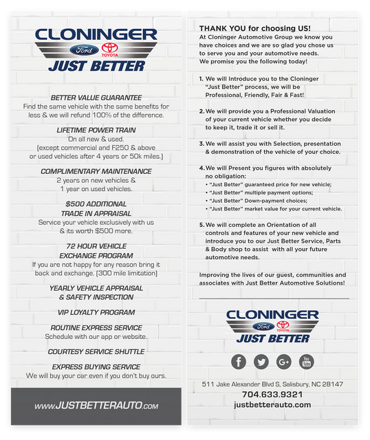 At Cloninger Ford -Toyota come see how we are your JUST BETTER dealership. Better People, Better Experience !!! We offer the following benefits: Better Value Guarantee, Lifetime Power Train (Some exclusions apply), $500 Additional Trade In Appraisal, 72 Hour Vehicle Exchange Program, Yearly Vehicle Appraisal & Safety Inspection, VIP Loyalty Program, Routine Express Service, Courtesy Service Shuttle, Express Buying Service. Also, as an added benefit we will buy your vehicle even if you don't buy ours!! One Year Appearance Protection $799 Not Included In Sales Price *PAINT PROTECTION Protects against fading, weather induced cracking or peeling, oxidation or loss of gloss. *FABRIC PROTECTION Protects against any normal oil-or water-based spills on the fabric. *VINYL & LEATHER PROTECTION Protects against fading and permanent staining caused by food or drink.*Customer must trade-in a vehicle to receive $1,000 Trade Assist credit that is included in the online price. **Financing must be provided by a third-party lender using this dealership’s assistance for Customer to receive $1,000 Financing Assist credit that is included in the online price. Does not include sales tax, DMV Fees, any lender fees for financing, plus dealer related fees for $899 doc and vehicle prep. See dealer for complete details.