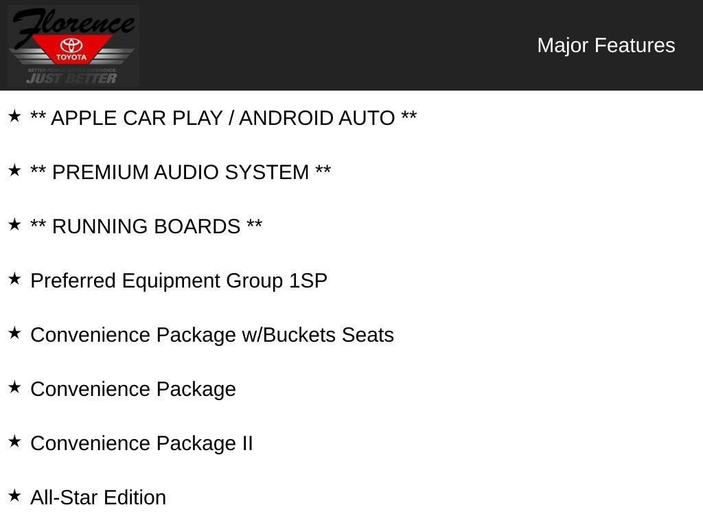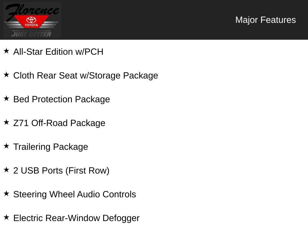 All-Star Edition: Trailering Package; Heavy-Duty Rear Locking Differential. Convenience Package. Convenience Package II: HD Rear Vision Camera; Premium Bose 7-Speaker Sound System; Power Sliding Rear Window with Rear Defogger; SiriusXM with 360L; 120-Volt Instrument Panel Power Outlet; Chevrolet Infotainment 3 Plus System Radio; 2 USB Ports; Universal Home Remote; HD Radio. Z71 Off-Road Package. Preferred Equipment Group 1SP: LED Cargo Area Lighting; Rear Vision Camera; Rear 60/40 Folding Bench Seat (folds Up); Cloth Seat Trim; Bluetooth® For Phone; Remote Vehicle Starter System; 2 USB Ports (first Row); Electric Rear-Window Defogger; Theft Deterrent System (unauthorized Entry); Compass; 4.2" Diagonal Color Display Driver Info Center; Electrical Lock Control Steering Column; Front LED Fog Lamps; Urethane Steering Wheel; Steering Wheel Audio Controls; Single-Zone Manual/semi-Automatic Air Conditioning; Color-Keyed Carpeting Floor Covering; OnStar and Chevrolet Connected Services Capable; Power Front Windows with Passenger Express Down; Front Rubberized Vinyl Floor Mats; Rear Rubberized-Vinyl Floor Mats; 4-Way Manual Driver Seat Adjuster; Deep-Tinted Glass; 6-Speaker Audio System; High Gloss Black Mirror Caps; Steering Wheel Mounted Electronic Cruise Control; Power Rear Windows with Express Down; Manual Tilt-Wheel Steering Column; Single-Speed Transfer Case; Body Color Grille; Power Front Windows with Driver Express Up/down; Rear Dual USB Charging-Only Ports; Front Frame-Mounted Black Recovery Hooks; Keyless Open and Start; 12-Volt Rear Auxiliary Power Outlet; Power Door Locks. Bed Protection Package: Rear Wheelhouse Liners; Chevytec Spray-On Black Bedliner. 6" Wheel to Wheel Black Tubular Assist Steps. 20" X 9" Painted Aluminum Wheels. Heavy-Duty Rear Locking Differential. Trailering Package. Integrated Trailer Brake Controller. 275/60R20SL AT BW Tires. Wheel Locks (set of 4). **Equipment listed is based on original vehicle build and subject to change. Please confirm the accuracy of the included equipment by calling the dealer prior to purchase.**