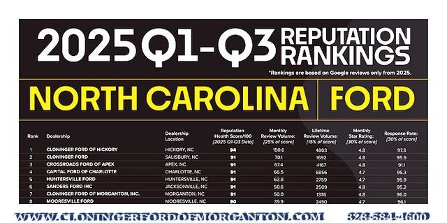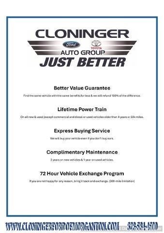 At Cloninger Ford of Morganton come see how we are your JUST BETTER dealership. We offer the following benefits: Better Value Guarantee,1st Year Maintenance, $500 Additional Trade In Appraisal, 72 Hour Vehicle Exchange Program, Yearly Vehicle Appraisal & Safety Inspection, VIP Loyalty Program, Routine Express Service, Courtesy Service Shuttle, Express Buying Service. Also, as a added benefit we will buy your vehicle even if you don't buy ours!! Call today (800)951-2277or visit us at www.cloningerfordofmorganton.com All pricing plus $1,299 Cloninger protection package and $899 documentation charge. All pricing includes discounts for dealer arranged financing.
