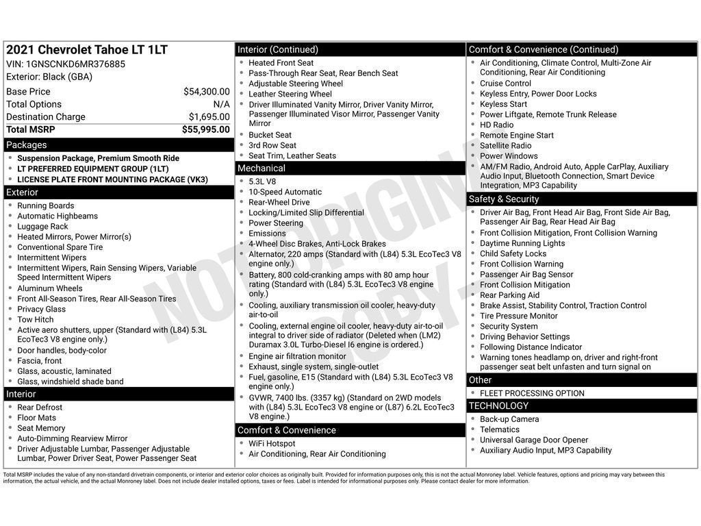 Start this 1/2 ton suv from inside with remote start. The rear parking assist technology on the Chevrolet Tahoe will put you at ease when reversing. The system alerts you as you get closer to an obstruction. The leather seats are soft and supportive on this 1/2 ton suv. Bluetooth® technology is built into this Chevrolet Tahoe, keeping your hands on the steering wheel and your focus on the road. This Chevrolet Tahoe offers Apple CarPlay for seamless connectivity. This 1/2 ton suv keeps you comfortable with Auto Climate. with XM/Sirus Satellite Radio you are no longer restricted by poor quality local radio stations while driving it. Anywhere on the planet, you will have hundreds of digital stations to choose from. It features a high end BOSE stereo system. This 2021 Chevrolet Tahoe offers Android Auto for seamless smartphone integration. Protect the Chevrolet Tahoe from unwanted accidents with a cutting edge backup camera system.