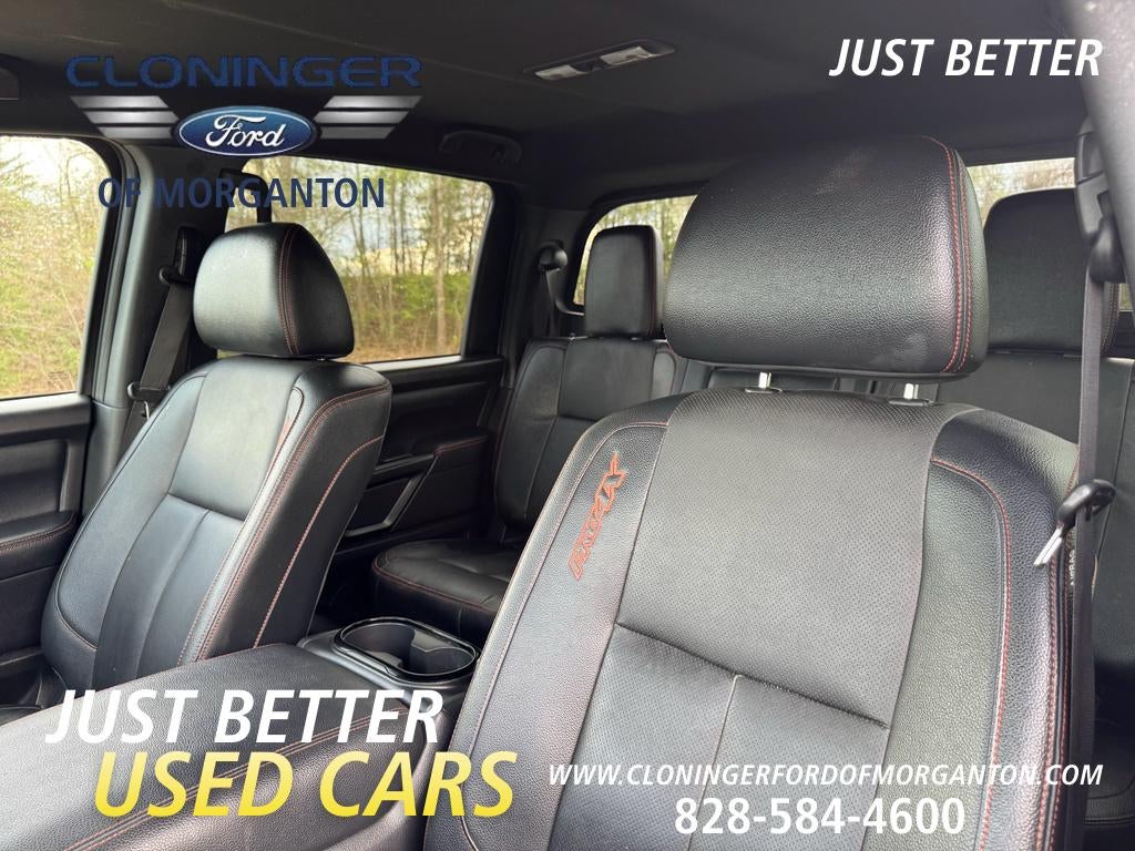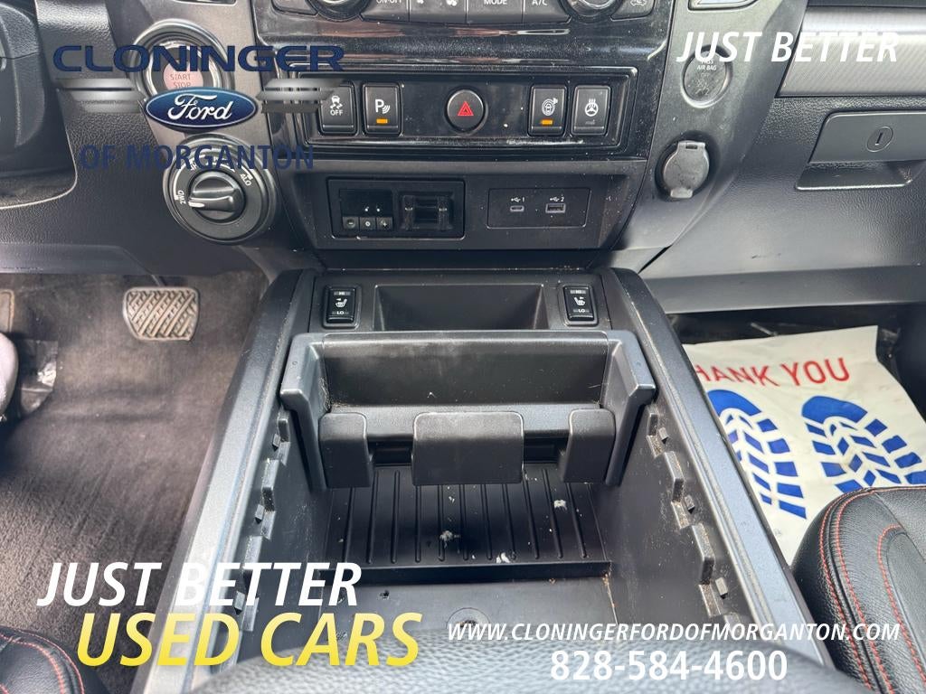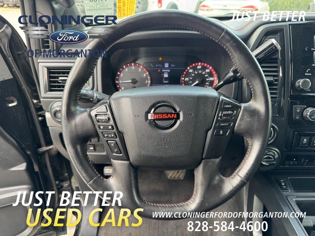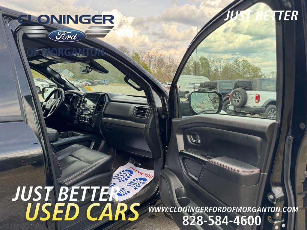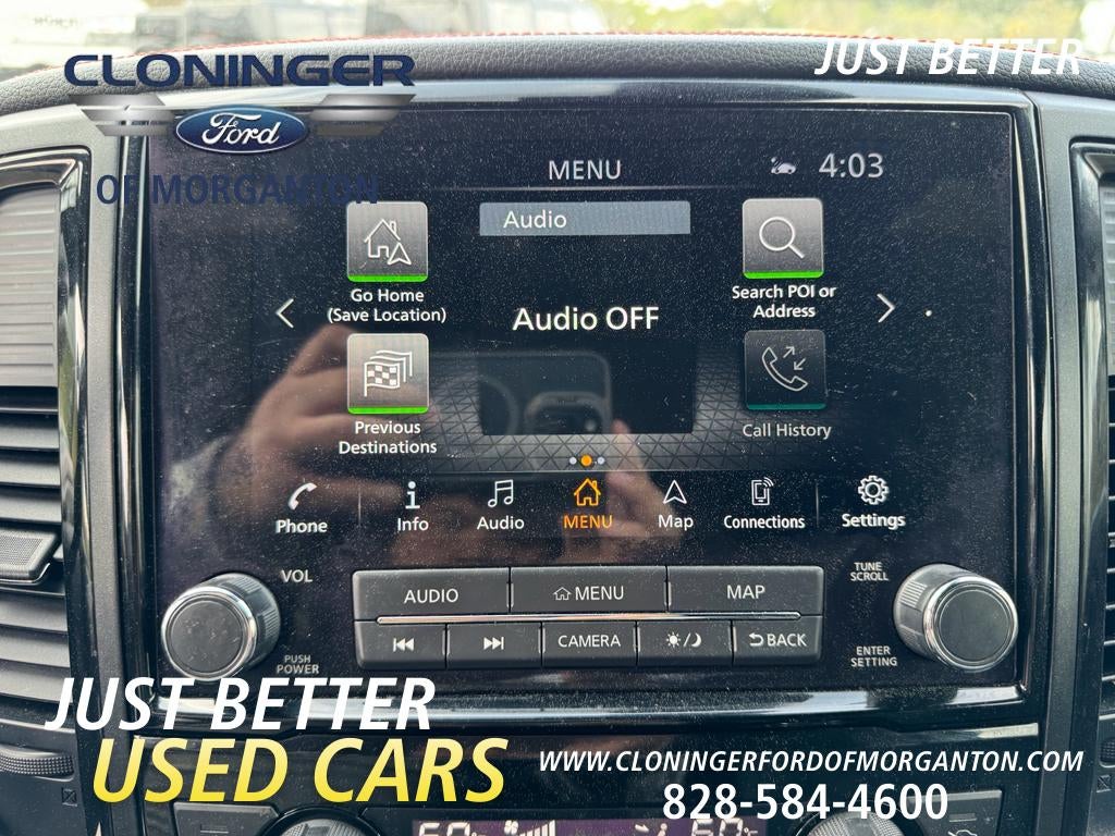 PRO-4X Convenience Package (4-Way Power Assist Seat, Heated Driver & Passenger Seat, Heated Power Tilt/Telescopic Steering Wheel, Heated Rear Seats, Intelligent Around View Monitor (I-AVM), Leather Seat Trim, Memory Driver Seat w/Auto Entry/Exit Feature, Power Folding Auto Dimming Outside Mirrors, and Side Turn Signal Lamps on Mirror Housing), PRO-4X Utility Package (Fender Premium Audio System w/12 Speakers and Proximity Activation), 4WD, 3.692 Axle Ratio, 4-Wheel Disc Brakes, 6 Speakers, ABS brakes, Air Conditioning, Alloy wheels, AM/FM radio: SiriusXM, Auto High-beam Headlights, Auto-dimming Rear-View mirror, Auto-leveling suspension, Automatic temperature control, Blind Spot Warning, Brake assist, Cloth Seat Trim w/Vinyl Bolsters, Compass, Delay-off headlights, Driver door bin, Driver vanity mirror, Dual front impact airbags, Dual front side impact airbags, Electronic Stability Control, Emergency communication system: NissanConnect Services, Front anti-roll bar, Front Bucket Seats, Front Captain's Seats, Front Center Armrest, Front dual zone A/C, Front fog lights, Front reading lights, Front wheel independent suspension, Fully automatic headlights, Garage door transmitter: HomeLink, Heated door mirrors, Illuminated entry, Knee airbag, Leather steering wheel, Low tire pressure warning, Navigation system: NissanConnect Navigation, NissanConnect featuring Apple CarPlay and Android Auto, Occupant sensing airbag, Outside temperature display, Overhead airbag, Overhead console, Panic alarm, Passenger door bin, Passenger vanity mirror, Power door mirrors, Power driver seat, Power steering, Power windows, PRO-4X Badged Floor Mats (DISC), Pro4X Mud Flaps, Radio data system, Radio: NissanConnect w/Navigation, Rain sensing wipers, Rear anti-roll bar, Rear Bumper Step w/Electronic Tailgate Lock, Rear Parking Sensors, Rear seat center armrest, Rear step bumper, Rear window defroster, Remote keyless entry, Security system, Speed control, Speed-sensing steering, Speed-Sensitive Wipers, Split folding rear seat, Steering wheel mounted audio controls, Tachometer, Telescoping steering wheel, Tilt steering wheel, Traction control, Trip computer, Variably intermittent wipers, Voltmeter, and Wheels: 18 x 8 Painted Dark Finish Alloy.