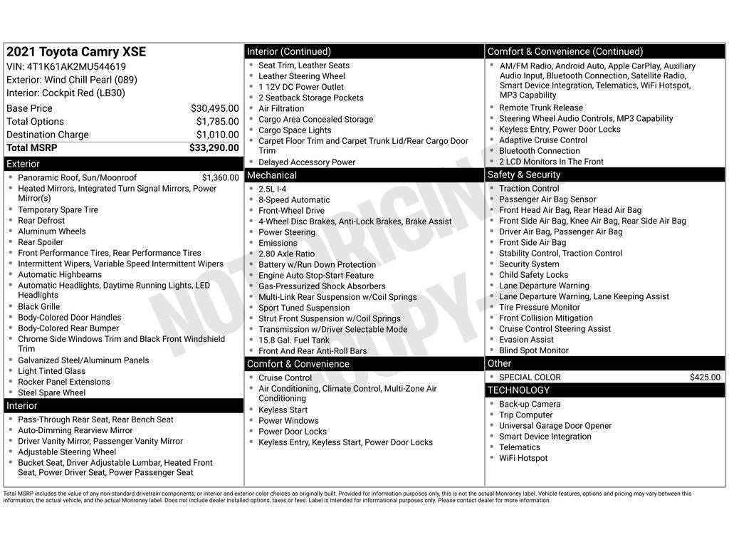 See what's behind you with the back up camera on the vehicle. This Toyota Camry offers Automatic Climate Control for personalized comfort. This Toyota Camry warns of approaching vehicles with Cross-Traffic Alert. The vehicle offers Android Auto for seamless smartphone integration. This Toyota Camry has a clean CARFAX vehicle history report. Never get into a cold vehicle again with the remote start feature on this 2021 Toyota Camry . Apple CarPlay: Seamless smartphone integration for the vehicle - stay connected and entertained on the go! It's blind spot monitor enhances safety. This unit features a hands-free Bluetooth® phone system. The leather seats in this model are a must for buyers looking for comfort, durability, and style. This 2021 Toyota Camry has a 4 Cyl, 2.5L high output engine. This Toyota Camry shines with clean polished lines coated with an elegant white finish. The Toyota Camry is front wheel drive. Set the temperature exactly where you are most comfortable in this model. The fan speed and temperature will automatically adjust to maintain your preferred zone climate.