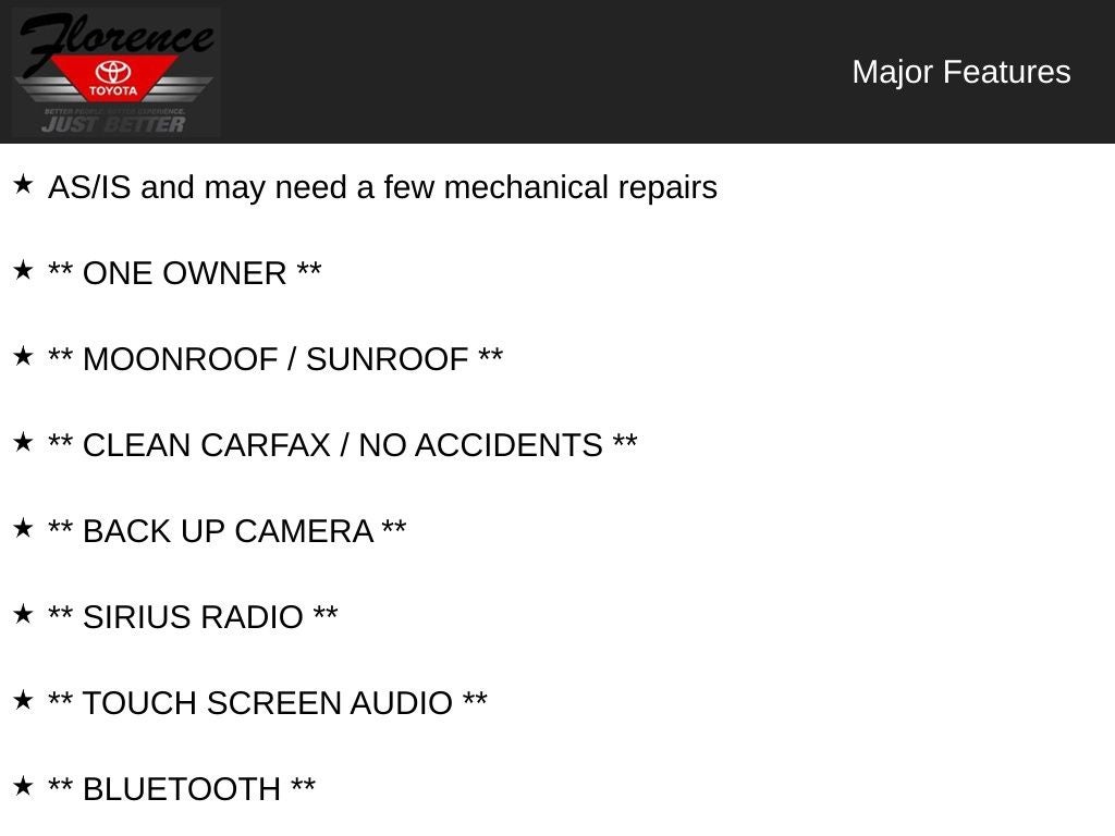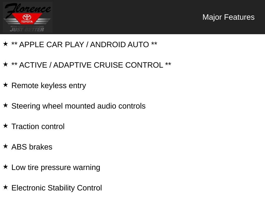 At Florence Toyota come see how our USED CARS are JUST BETTER . We offer the following benefits: Lifetime Power Train (Some exclusions apply), 1st Year Maintenance, $500 Additional Trade In Appraisal, 72 Hour Vehicle Exchange Program, Yearly Vehicle Appraisal & Safety Inspection, VIP Loyalty Program, Routine Express Service, Courtesy Service Shuttle, Express Buying Service. Also, as an added benefit we will buy your vehicle even if you don't buy ours!! Call today (866)830-0793or visit us at www.florencetoyota.com *Customer must trade-in a vehicle to receive $1,000 Trade Assist credit that is included in the online price. **Financing must be provided by a third-party lender using this dealership’s assistance for Customer to receive $1,000 Financing Assist credit that is included in the online price. See dealer for complete details.