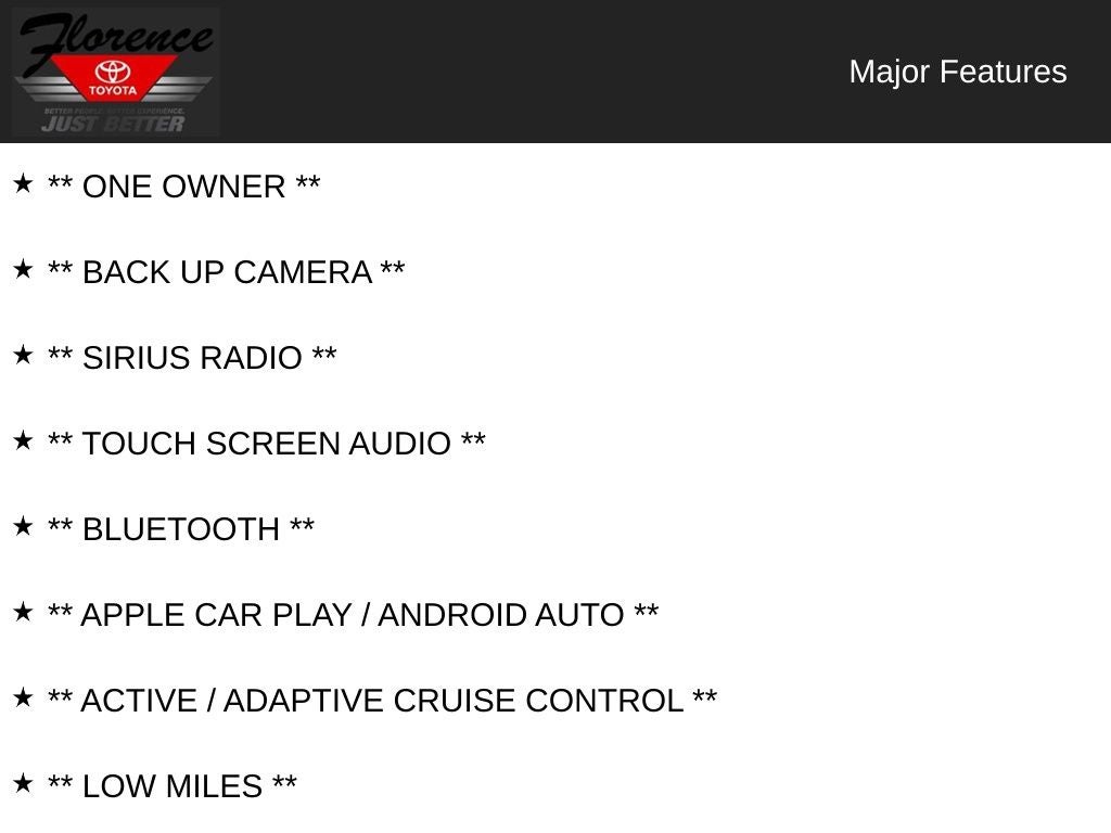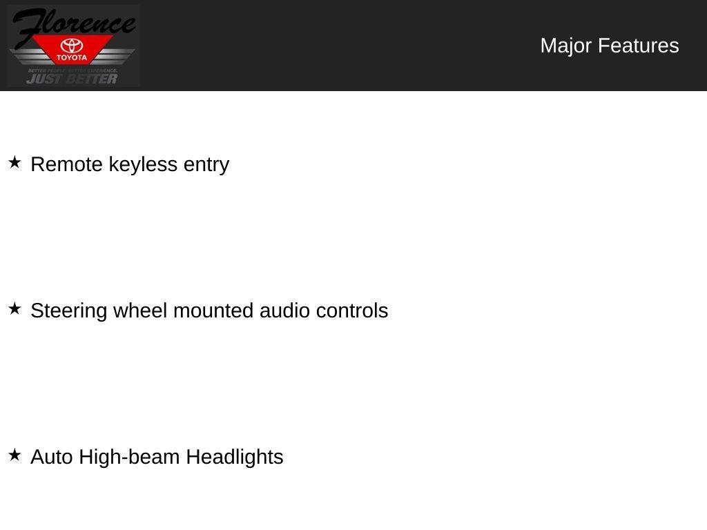 At Florence Toyota, come see how our USED CARS are JUST BETTER. We offer the following benefits: Lifetime Power Train (Some exclusions apply), 1st Year Maintenance, $500 Additional Trade In Appraisal, 72 Hour Vehicle Exchange Program, Yearly Vehicle Appraisal & Safety Inspection, VIP Loyalty Program, Routine Express Service, Courtesy Service Shuttle, Express Buying Service. Also, as an added benefit we will buy your vehicle even if you don't buy ours!! Call today (866)830-0793 or visit us at www.florencetoyota.com *Customer must trade-in a vehicle to receive $1,000 Trade Assist credit that is included in the online price. **Financing must be provided by a third-party lender using this dealership's assistance for Customer to receive $1,000 Financing Assist credit that is included in the online price. See dealer for complete details.
