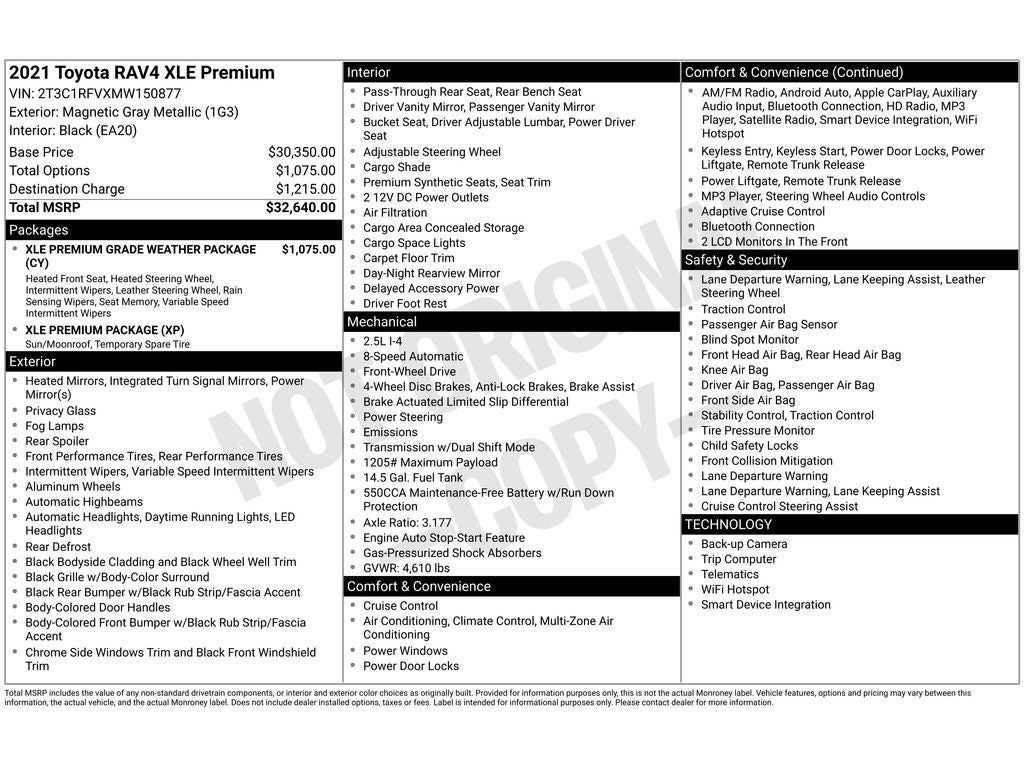 This small SUV will zip through traffic. This vehicle is a certified CARFAX 1-owner. Our dealership has already run the CARFAX report and it is clean. A clean CARFAX is a great asset for resale value in the future. The leather seats in this vehicle are a must for buyers looking for comfort, durability, and style. Help alleviate lower back pain with the driver seat lumbar support in this 2021 Toyota RAV4 . This small suv is pure luxury with a heated steering wheel. Load groceries and much more with ease into this Toyota RAV4 thanks to the power liftgate. This small suv offers Android Auto for seamless smartphone integration. The vehicle offers Apple CarPlay for seamless connectivity. Bluetooth® technology is built into this small suv, keeping your hands on the steering wheel and your focus on the road. Protect this unit from unwanted accidents with a cutting edge backup camera system. The vehicle warns of approaching vehicles with Cross-Traffic Alert. This vehicle features cruise control for long trips. This small suv has fog lights for all weather conditions.
