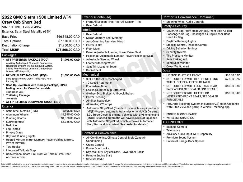 Driver Alert Package I: Ultrasonic Front and Rear Park Assist; Rear Cross Traffic Alert; Perimeter Lighting; Lane Change Alert with Side Blind Zone Alert. Preferred Equipment Group 4SB: Perforated Leather Front Seat Trim; 2 USB Ports (1st Row); 3.23 Rear Axle Ratio; Electric Rear-Window Defogger; Theft Deterrent System (unauthorized Entry); Body-Colour Surround Grille; Heavy-Duty Air Filter; Skid Plates; Compass; 4.2" Diagonal Colour Display Driver Info Centre; Heated Steering Wheel; 120-Volt Instrument Panel Power Outlet; Front Bucket Seats; Front Premium Floor Liners with Removable Carpet Insert; 10-Speed Automatic Transmission; Colour-Keyed Carpeting Floor Covering; OnStar and GMC Connected Services Capable; Power Front Passenger Windows with Express Up/down; Power Rear Windows with Express Down; Integrated Trailer Brake Controller; Manual Tilt-Wheel and Telescoping Steering Column; HD Rear Vision Camera; LED Cargo Area Lighting; Remote Vehicle Starter System; 7. 100 lbs (3. 221 Kgs) GVWR; Hill Descent Control; Floor-Mounted Centre Console; Duramax 3.0L Turbo-Diesel I6 Engine; Trailering Package; Off-Road Suspension; Steering Wheel Audio Controls; GMC Connected Access Capable; 2-Speed Transfer Case; Deep-Tinted Glass; Spray-On Pickup Bed Liner with AT4 Logo; Red Recovery Hooks; Power Front Windows with Driver Express Up/down; Rear Dual USB Charging-Only Ports; Keyless Open and Start; Wi-Fi Hotspot Capable; ProGrade Trailering System; Rear Wheelhouse Liners; 12-Volt Rear Auxiliary Power Outlet; 2 USB Ports; Auto-Locking Rear Differential; Power Door Locks. AT4 Preferred Package: Premium Bose 7-Speaker Sound System; Power Sliding Rear Window with Rear Defogger; Wireless Charging; Universal Home Remote; Premium GMC Infotainment System Radio with Navigation. 20" X 9" Machined Aluminum Wheels. AT4 High Clearance Step. Power Sunroof. Satin Steel Metallic. **Equipment listed is based on original vehicle build and subject to change. Please confirm the accuracy of the included equipment by calling the dealer prior to purchase.**