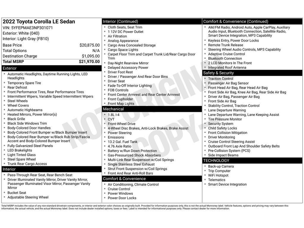 This small car comes equipped with Android Auto for seamless smartphone integration on the road. See what's behind you with the back up camera on this Toyota Corolla. This 2022 Toyota Corolla has a clean CARFAX vehicle history report. This Toyota Corolla features a hands-free Bluetooth® phone system. Apple CarPlay: Seamless smartphone integration for it - stay connected and entertained on the go! Good News! This certified CARFAX 1-owner vehicle has only had one owner before you. This Toyota Corolla keeps you comfortable with Auto Climate. This 2022 Toyota Corolla has a 4 Cyl, 1.8L high output engine. This unit is front wheel drive. This unit shines with clean polished lines coated with an elegant white finish. Set the temperature exactly where you are most comfortable in the Toyota Corolla. The fan speed and temperature will automatically adjust to maintain your preferred zone climate. This vehicle features cruise control for long trips.