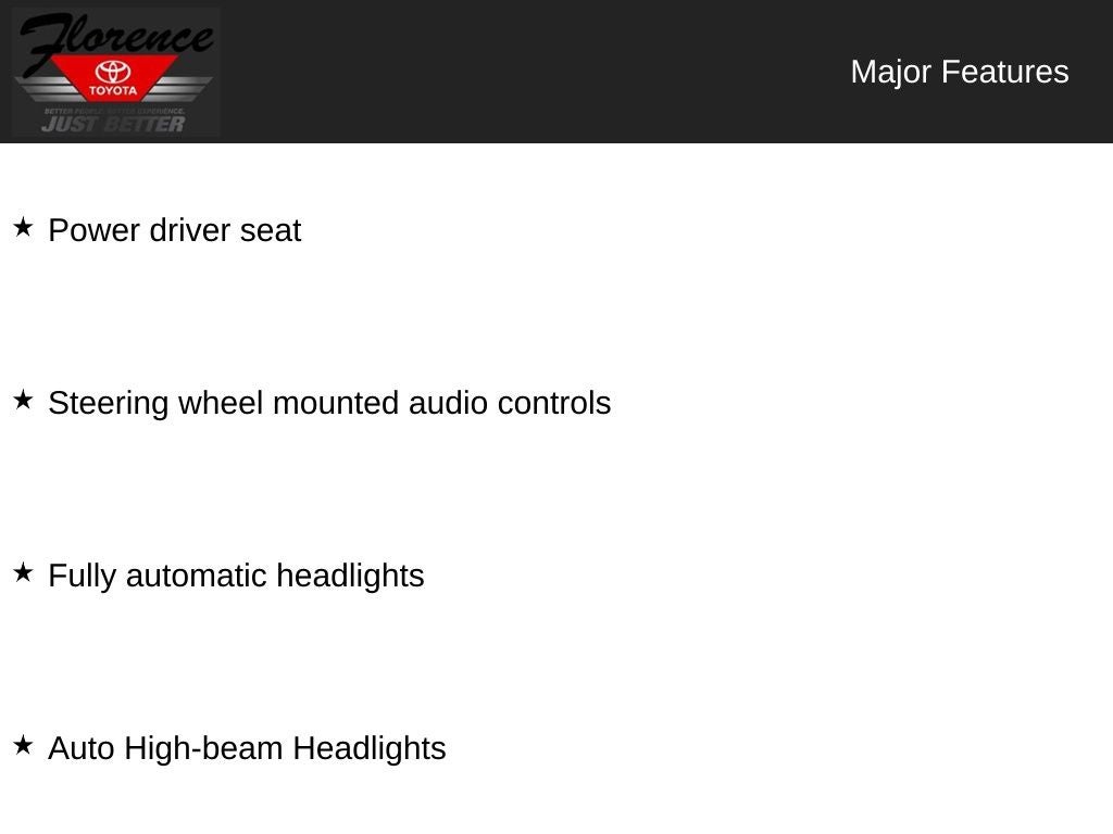 At Florence Toyota, come see how our USED CARS are JUST BETTER. We offer the following benefits: Lifetime Power Train (Some exclusions apply), 1st Year Maintenance, $500 Additional Trade In Appraisal, 72 Hour Vehicle Exchange Program, Yearly Vehicle Appraisal & Safety Inspection, VIP Loyalty Program, Routine Express Service, Courtesy Service Shuttle, Express Buying Service. Also, as an added benefit we will buy your vehicle even if you don't buy ours!! Call today (866)830-0793 or visit us at www.florencetoyota.com *Customer must trade-in a vehicle to receive $1,000 Trade Assist credit that is included in the online price. **Financing must be provided by a third-party lender using this dealership's assistance for Customer to receive $1,000 Financing Assist credit that is included in the online price. See dealer for complete details.