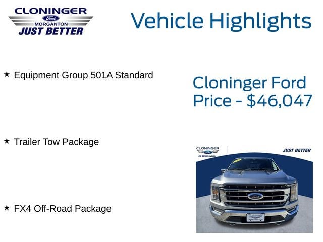 Equipment Group 501A Standard, FX4 Off-Road Package (4x4 FX4 Off-Road Bodyside Decal, Hill Descent Control, Monotube Rear Shocks, Off-Road Tuned Front Shock Absorbers, and Rock Crawl Mode), Trailer Tow Package (Class IV Trailer Hitch Receiver, Integrated Trailer Brake Controller, and Pro Trailer Backup Assist & Pro Trailer Hitch Assist), 4WD, Adjustable pedals, 4-Wheel Disc Brakes, 8 Speakers, ABS brakes, Air Conditioning, Alloy wheels, AM/FM radio: SiriusXM with 360L, Auto High-beam Headlights, Auto Start-Stop Removal (DISC), Auto-dimming door mirrors, Auto-dimming Rear-View mirror, Automatic temperature control, Brake assist, Bumpers: chrome, Chrome wheels, Compass, Delay-off headlights, Driver door bin, Driver vanity mirror, Dual front impact airbags, Dual front side impact airbags, Electronic Stability Control, Emergency communication system: SYNC 4 911 Assist, Extended Range 36 Gallon Fuel Tank, Exterior Parking Camera Rear, Front anti-roll bar, Front Bucket Seats, Front Center Armrest, Front dual zone A/C, Front fog lights, Front reading lights, Front wheel independent suspension, Fully automatic headlights, Garage door transmitter, Heated door mirrors, Heated front seats, Heated steering wheel, Illuminated entry, Inclination/Intrusion Sensor Removal, Leather-Trimmed Bucket Seats, LED Sideview Mirror Spotlights, Low tire pressure warning, Memory seat, Occupant sensing airbag, Outside temperature display, Overhead airbag, Overhead console, Panic alarm, Passenger door bin, Passenger vanity mirror, Pedal memory, Power door mirrors, Power driver seat, Power passenger seat, Power steering, Power windows, Radio data system, Radio: B&O Sound System by Bang & Olufsen, Rear reading lights, Rear seat center armrest, Rear step bumper, Rear window defroster, Remote keyless entry, Security system, Speed control, Speed-sensing steering, Split folding rear seat, Steering Wheel Heat Removal (DISC), Steering wheel mounted audio controls, SYNC 4 w/Enhanced Voice Recognition, Tachometer, Telescoping steering wheel, Tilt steering wheel, Traction control, Tray Style Floor Liner (47W), Trip computer, Turn signal indicator mirrors, Variably intermittent wipers, Ventilated front seats, Voltmeter, Wheels: 18 Chrome-Like PVD, and Wheels: 20 Chrome-Like PVD.