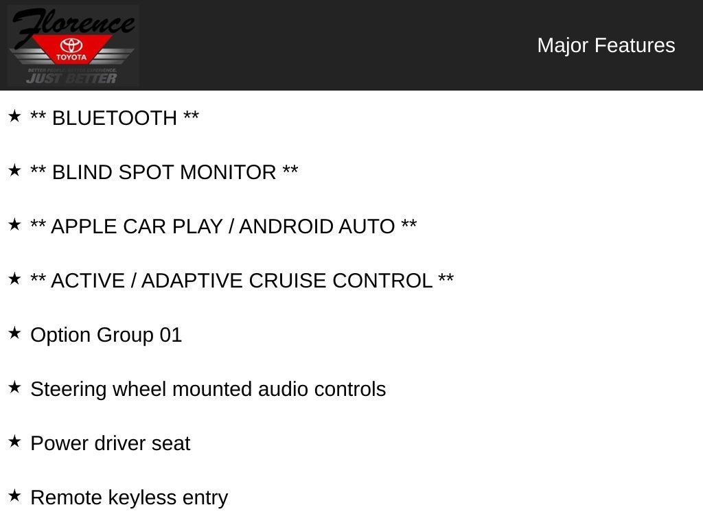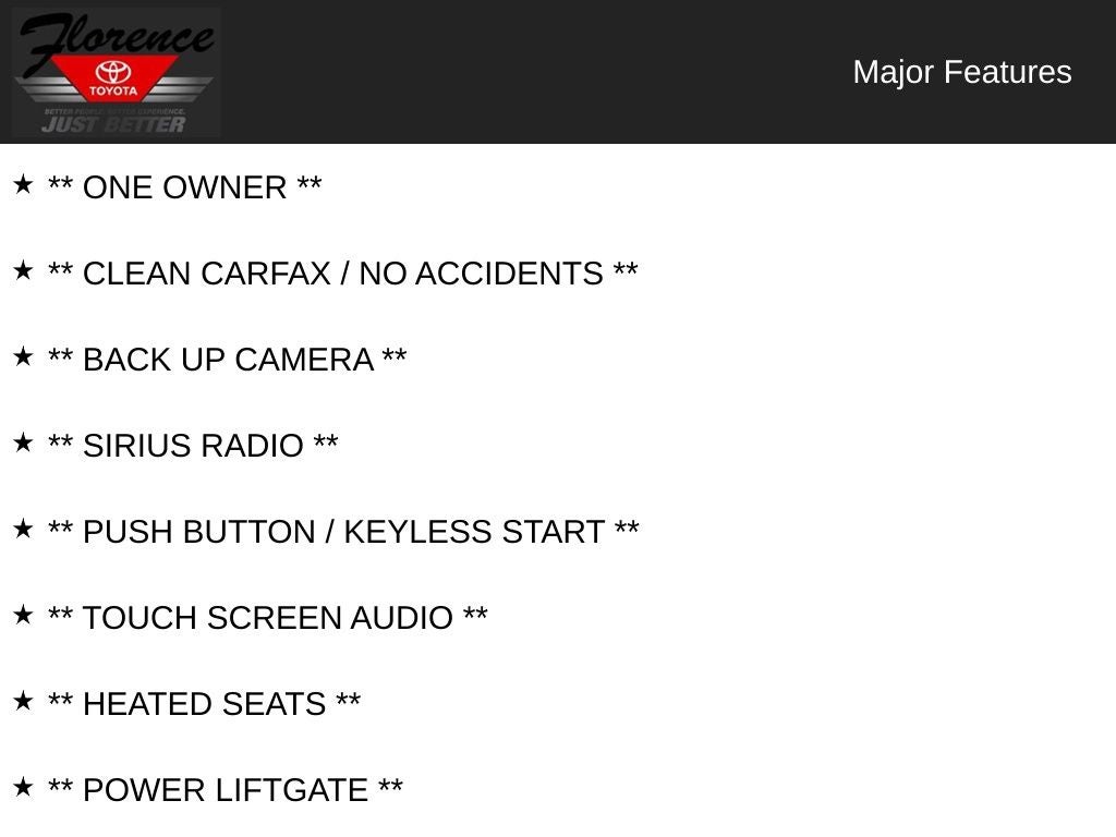 At Florence Toyota come see how our USED CARS are JUST BETTER . We offer the following benefits: Lifetime Power Train (Some exclusions apply), 1st Year Maintenance, $500 Additional Trade In Appraisal, 72 Hour Vehicle Exchange Program, Yearly Vehicle Appraisal & Safety Inspection, VIP Loyalty Program, Routine Express Service, Courtesy Service Shuttle, Express Buying Service. Also, as an added benefit we will buy your vehicle even if you don't buy ours!! Call today (866)830-0793 or visit us at www.florencetoyota.com *Customer must trade-in a vehicle to receive $1,000 Trade Assist credit that is included in the online price. **Financing must be provided by a third-party lender using this dealership's assistance for Customer to receive $1,000 Financing Assist credit that is included in the online price. See dealer for complete details.