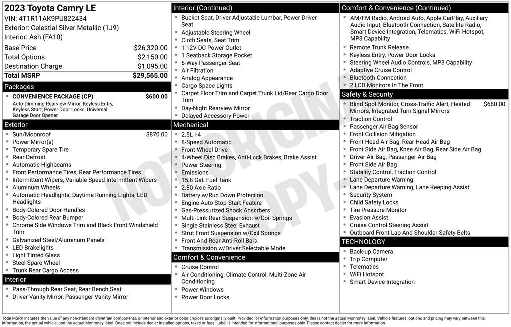 Experience the exceptional value of this 2023 Toyota Camry LE. With its sleek silver exterior, this one-owner vehicle boasts a wealth of premium features that elevate your driving experience. Powered by a 2.5L I4 DOHC 16V engine and an 8-speed automatic transmission, the Camry LE delivers an impressive 28 city and 39 highway MPG, making it an exceptional choice for your daily commute or weekend adventures.