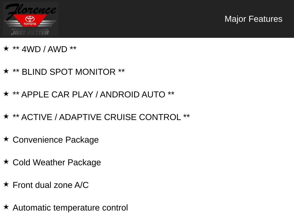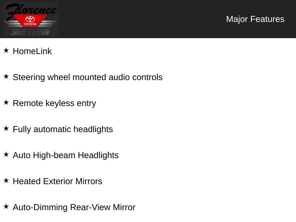 At Florence Toyota come see how our USED CARS are JUST BETTER . We offer the following benefits: Lifetime Power Train (Some exclusions apply), 1st Year Maintenance, $500 Additional Trade In Appraisal, 72 Hour Vehicle Exchange Program, Yearly Vehicle Appraisal & Safety Inspection, VIP Loyalty Program, Routine Express Service, Courtesy Service Shuttle, Express Buying Service. Also, as an added benefit we will buy your vehicle even if you don't buy ours!! Call today (866)830-0793 or visit us at www.florencetoyota.com *Customer must trade-in a vehicle to receive $1,000 Trade Assist credit that is included in the online price. **Financing must be provided by a third-party lender using this dealership's assistance for Customer to receive $1,000 Financing Assist credit that is included in the online price. See dealer for complete details.