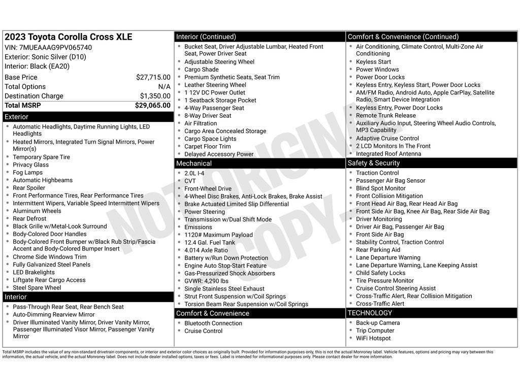 2023 Toyota Corolla Cross XLE - located in Florence, SC - blends refined comfort, modern technology, and efficient performance in a compact SUV package. With just 35,785 miles, this front-wheel-drive Toyota Corolla Cross is powered by a responsive 2.0L 4-cylinder gasoline engine that delivers smooth daily driving and strong fuel economy. The XLE trim adds upscale touches including premium leather seats and Automatic Climate Control for personalized comfort on every trip. Safety and convenience are prioritized with a Back-Up Camera and Blind Spot Monitor to assist in crowded parking lots and highway lane changes. Hands-Free Bluetooth® connectivity keeps you connected on the go, allowing seamless calls and audio streaming without distractions. Interior space is thoughtfully designed for passenger comfort and cargo flexibility, making it ideal for commuters, small families, or anyone needing versatile utility with a refined cabin. Exterior styling is modern and purposeful, while Toyota's reputation for reliability and resale value gives additional peace of mind. Located in Florence, SC, this low-mileage 2023 Toyota Corolla Cross XLE offers a well-rounded combination of style, safety, and efficiency. Schedule a test drive to experience the responsive 2.0L engine, comfortable leather interior, and driver-assist features firsthand - a practical choice for drivers seeking a dependable compact SUV.