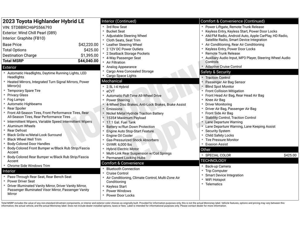 Discover exceptional value with this 2023 Toyota Highlander Hybrid LE AWD, now available in Florence, SC. With just 20,316 miles, this low-mileage Toyota Highlander Hybrid combines efficiency and capability with Toyota's proven 4‑cylinder, 2.5L Full Hybrid Electric (FHEV) powertrain and all‑wheel drive for confident handling in any season. This Highlander delivers outstanding fuel economy without sacrificing space or comfort, making it an ideal choice for families, commuters, and road‑trip enthusiasts. Loaded with modern connectivity and safety features, this Highlander includes Apple CarPlay and Android Auto for seamless smartphone integration, Hands-Free Bluetooth® for easy calls and audio streaming, and Remote Start for quick climate control on chilly or hot mornings. Advanced driver assistance like Cross-Traffic Alert adds an extra layer of confidence when backing out of tight spots. The LE trim balances practical convenience and thoughtful comfort—ample cargo capacity, supportive seating, and intuitive controls make daily driving effortless. Located in Florence, SC, this Toyota Highlander Hybrid is competitively priced and offers the best price for comparable models in the area. Low mileage, hybrid efficiency, AWD capability, and a comprehensive feature set make this vehicle a smart, budget-friendly choice. Don't miss your chance to own a reliable, fuel-efficient 2023 Toyota Highlander Hybrid LE—contact us today to schedule a test drive and experience this exceptional value in person.