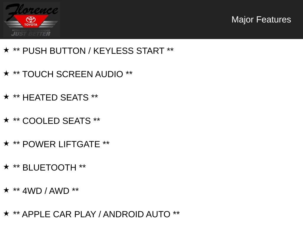 At Florence Toyota, we are committed to providing our customers with an exceptional buying experience. Come see how our USED CARS are JUST BETTER. We offer a Lifetime Powertrain Warranty, 1st Year Maintenance, $500 Additional Trade-In Appraisal, a 72-Hour Vehicle Exchange Program, and much more. Call us today at (866)830-0793 or visit us at www.florencetoyota.com to experience the difference.