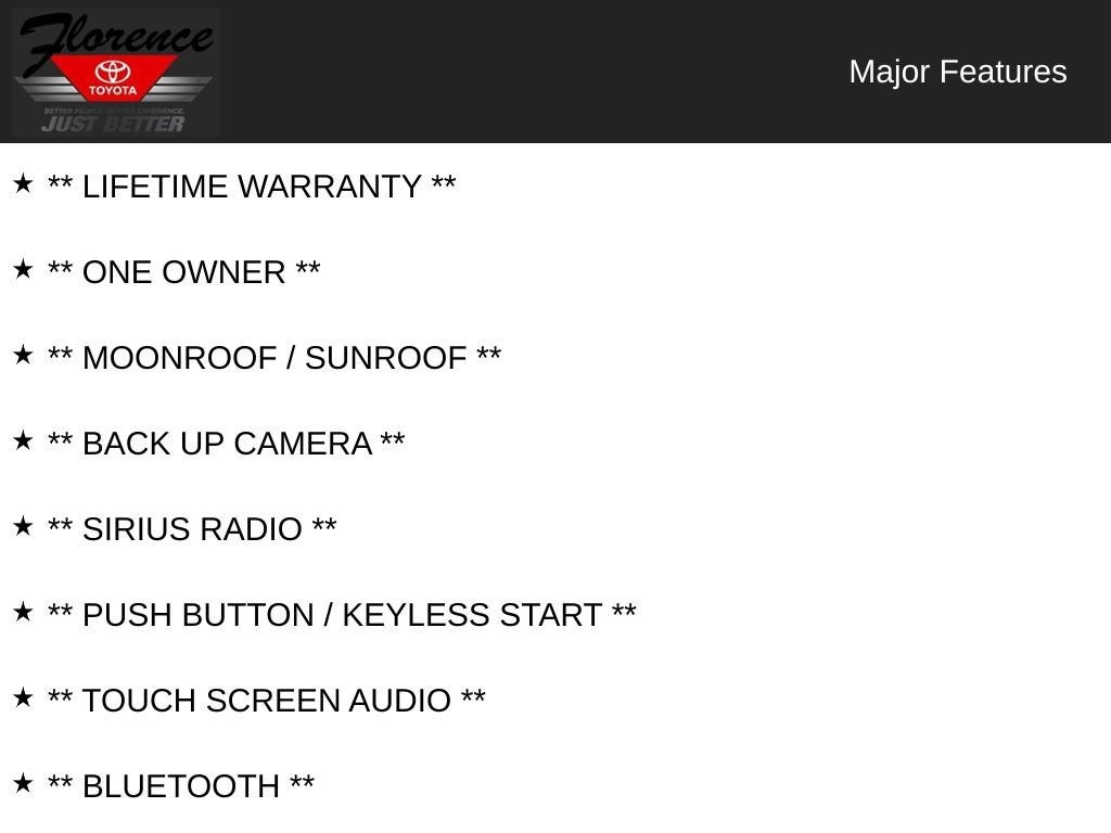 Convenience Package: Tilt and Slide Moon Roof; Front Door Smart Key System with Push Button Start. **Equipment listed is based on original vehicle build and subject to change. Please confirm the accuracy of the included equipment by calling the dealer prior to purchase.**