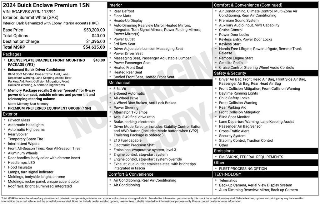 ** ONE OWNER **, ** LEATHER SEATING **, ** FACTORY NAVIGATION **, ** CLEAN CARFAX / NO ACCIDENTS **, ** BACK UP CAMERA **, ** SIRIUS RADIO **, ** PUSH BUTTON / KEYLESS START **, ** TOUCH SCREEN AUDIO **, ** HEATED SEATS **, ** COOLED SEATS **, ** POWER LIFTGATE **, ** 3RD ROW SEATING **, ** Bluetooth® **, ** 4WD / AWD **, ** BLIND SPOT MONITOR **, ** APPLE CAR PLAY / ANDROID AUTO **, ** PREMIUM AUDIO SYSTEM **, Enclave Premium Group, 4D Sport Utility, 3.6L V6 SIDI VVT, 9-Speed Automatic, AWD, 6-Way Power Front Passenger Seat Adjuster, 8-Way Power Driver Seat Adjuster, Auto High-beam Headlights, Automatic temperature control, Front dual zone A/C, Fully automatic headlights, Heads-Up Display, Memory seat, Power driver seat, Rear air conditioning, Steering wheel memory, Steering wheel mounted audio controls.
