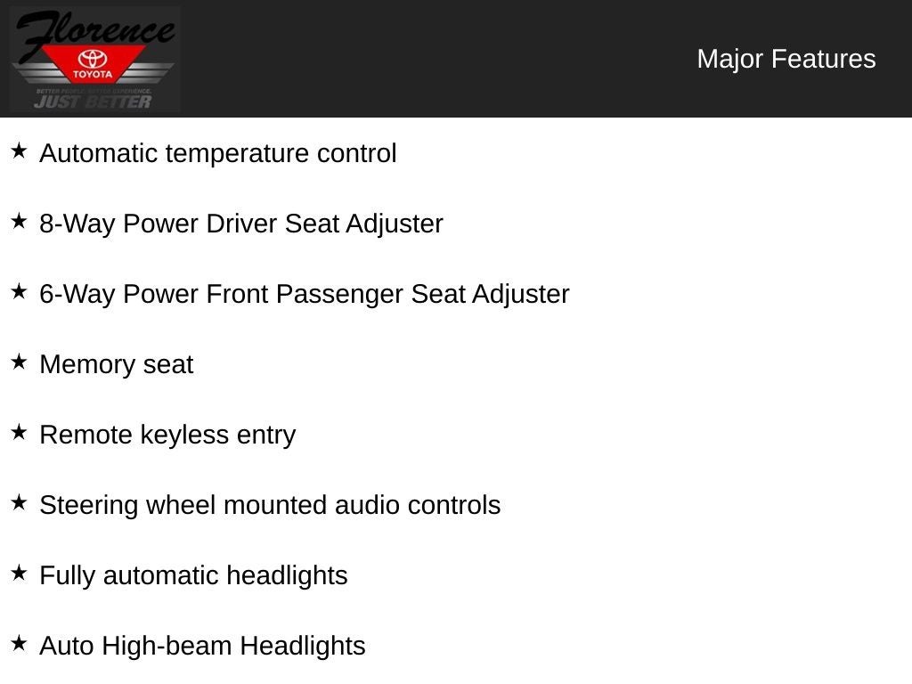 At Florence Toyota, come see how our USED CARS are JUST BETTER. We offer the following benefits: Lifetime Power Train (Some exclusions apply), 1st Year Maintenance, $500 Additional Trade In Appraisal, 72 Hour Vehicle Exchange Program, Yearly Vehicle Appraisal & Safety Inspection, VIP Loyalty Program, Routine Express Service, Courtesy Service Shuttle, Express Buying Service. Also, as an added benefit we will buy your vehicle even if you don't buy ours!! Call today (866)830-0793 or visit us at www.florencetoyota.com *Customer must trade-in a vehicle to receive $1,000 Trade Assist credit that is included in the online price. **Financing must be provided by a third-party lender using this dealership's assistance for Customer to receive $1,000 Financing Assist credit that is included in the online price. See dealer for complete details.