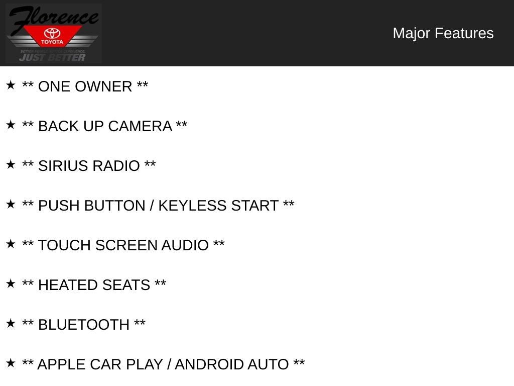 At Florence Toyota, come see how our USED CARS are JUST BETTER. We offer the following benefits: Lifetime Power Train (Some exclusions apply), 1st Year Maintenance, $500 Additional Trade In Appraisal, 72 Hour Vehicle Exchange Program, Yearly Vehicle Appraisal & Safety Inspection, VIP Loyalty Program, Routine Express Service, Courtesy Service Shuttle, Express Buying Service. Also, as an added benefit we will buy your vehicle even if you don't buy ours!! Call today (866)830-0793 or visit us at www.florencetoyota.com *Customer must trade-in a vehicle to receive $1,000 Trade Assist credit that is included in the online price. **Financing must be provided by a third-party lender using this dealership's assistance for Customer to receive $1,000 Financing Assist credit that is included in the online price. See dealer for complete details.