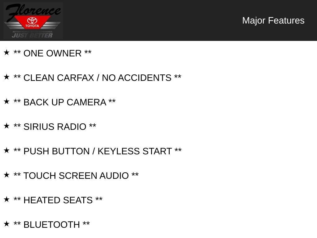 At Florence Toyota, come see how our USED CARS are JUST BETTER. We offer the following benefits: Lifetime Power Train (Some exclusions apply), 1st Year Maintenance, $500 Additional Trade In Appraisal, 72 Hour Vehicle Exchange Program, Yearly Vehicle Appraisal & Safety Inspection, VIP Loyalty Program, Routine Express Service, Courtesy Service Shuttle, Express Buying Service. Also, as an added benefit we will buy your vehicle even if you don't buy ours!! Call today (866)830-0793 or visit us at www.florencetoyota.com *Customer must trade-in a vehicle to receive $1,000 Trade Assist credit that is included in the online price. **Financing must be provided by a third-party lender using this dealership's assistance for Customer to receive $1,000 Financing Assist credit that is included in the online price. See dealer for complete details.