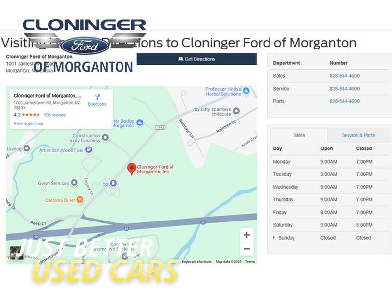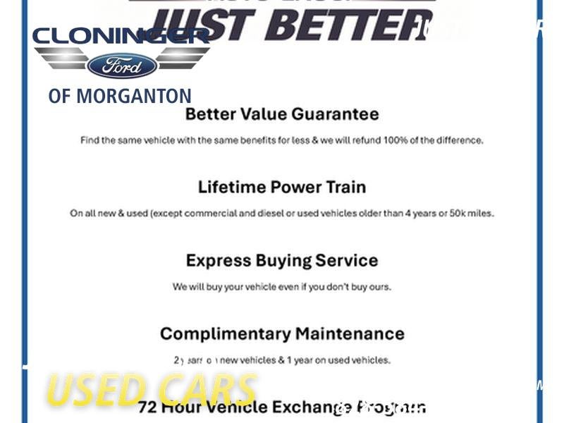 At Cloninger Ford of Morganton come see how we are your JUST BETTER dealership. We offer the following benefits: Better Value Guarantee,1st Year Maintenance, $500 Additional Trade In Appraisal, 72 Hour Vehicle Exchange Program, Yearly Vehicle Appraisal & Safety Inspection, VIP Loyalty Program, Routine Express Service, Courtesy Service Shuttle, Express Buying Service. Also, as a added benefit we will buy your vehicle even if you don't buy ours!! Call today (800)951-2277or visit us at www.cloningerfordofmorganton.com All pricing plus $799 appearance protection package and $899 documentation charge. All pricing includes discounts for dealer arranged financing.