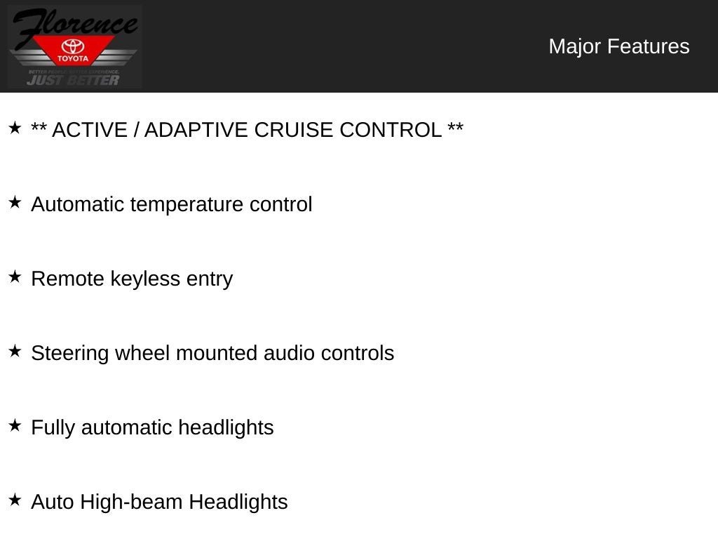 - Adaptive Cruise Control: Adaptive Cruise Control (ACC) with Low-Speed Follow