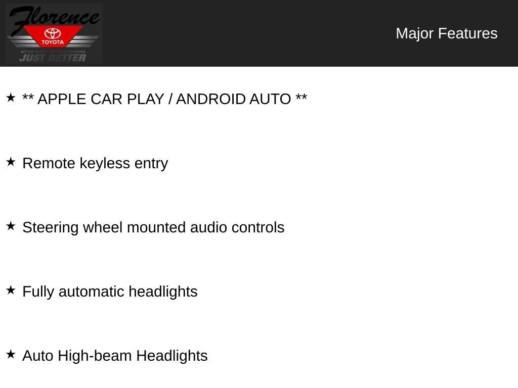 At Florence Toyota, come see how our USED CARS are JUST BETTER. We offer the following benefits: Lifetime Power Train (Some exclusions apply), 1st Year Maintenance, $500 Additional Trade In Appraisal, 72 Hour Vehicle Exchange Program, Yearly Vehicle Appraisal & Safety Inspection, VIP Loyalty Program, Routine Express Service, Courtesy Service Shuttle, Express Buying Service. Also, as an added benefit, we will buy your vehicle even if you don't buy ours!! Call today (866)830-0793 or visit us at www.florencetoyota.com *Customer must trade-in a vehicle to receive $1,000 Trade Assist credit that is included in the online price. **Financing must be provided by a third-party lender using this dealership's assistance for Customer to receive $1,000 Financing Assist credit that is included in the online price. See dealer for complete details.
