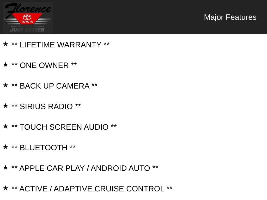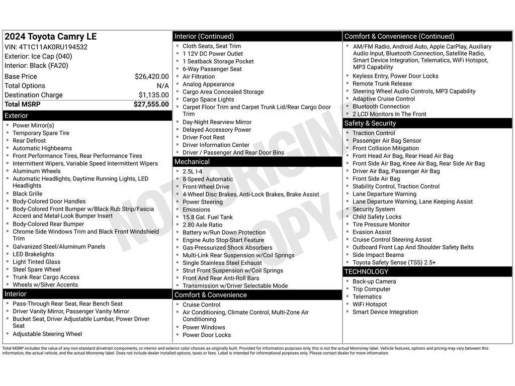 Clean, reliable, and ready for the road - this 2024 Toyota Camry LE in Florence, SC is a smart choice for drivers who value comfort and modern tech. Powered by a responsive 2.5L 4-cylinder engine with Front-Wheel Drive, this Toyota Camry delivers smooth daily performance and confident handling. With just 44,970 miles and a CARFAX 1-Owner history, this vehicle has been well-maintained and offers peace of mind for your next vehicle purchase. Inside, enjoy Automatic Climate Control for consistent comfort and a thoughtfully designed cabin that makes every trip pleasant. Stay connected with Apple CarPlay and Android Auto integration, providing seamless access to calls, navigation, music, and apps through the car's infotainment system. The Back-Up Camera enhances safety and convenience when parking or maneuvering in tight spaces. This Toyota Camry LE combines Toyota's reputation for durability with modern convenience features suited to commuters, families, and road-trip enthusiasts alike. Located in Florence, SC, it's available for viewing and test drives today. Contact us to schedule an appointment and see why the 2024 Toyota Camry LE remains a top pick for value, technology, and dependable performance.