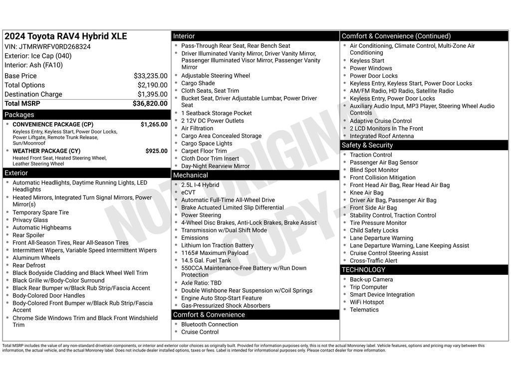 This vehicle's Cross-Traffic Alert: Safeguarding you from unexpected traffic when reversing. The vehicle offers Apple CarPlay for seamless connectivity. This unit enhances safety with a blind spot monitor, alerting drivers to potential dangers in adjacent lanes. This vehicle is a certified CARFAX 1-owner. Protect this Toyota RAV4 Hybrid from unwanted accidents with a cutting edge backup camera system. This 2024 Toyota RAV4 Hybrid offers Automatic Climate Control for personalized comfort. This small suv is pure luxury with a heated steering wheel. This 2024 Toyota RAV4 Hybrid comes equipped with Android Auto for seamless smartphone integration on the road. Bluetooth® technology is built into the vehicle, keeping your hands on the steering wheel and your focus on the road. This model is equipped with all wheel drive. It has a 4 Cyl, 2.5L high output engine. This unit embodies class and sophistication with its refined white exterior. Enjoy the convenience of the power liftgate on it.