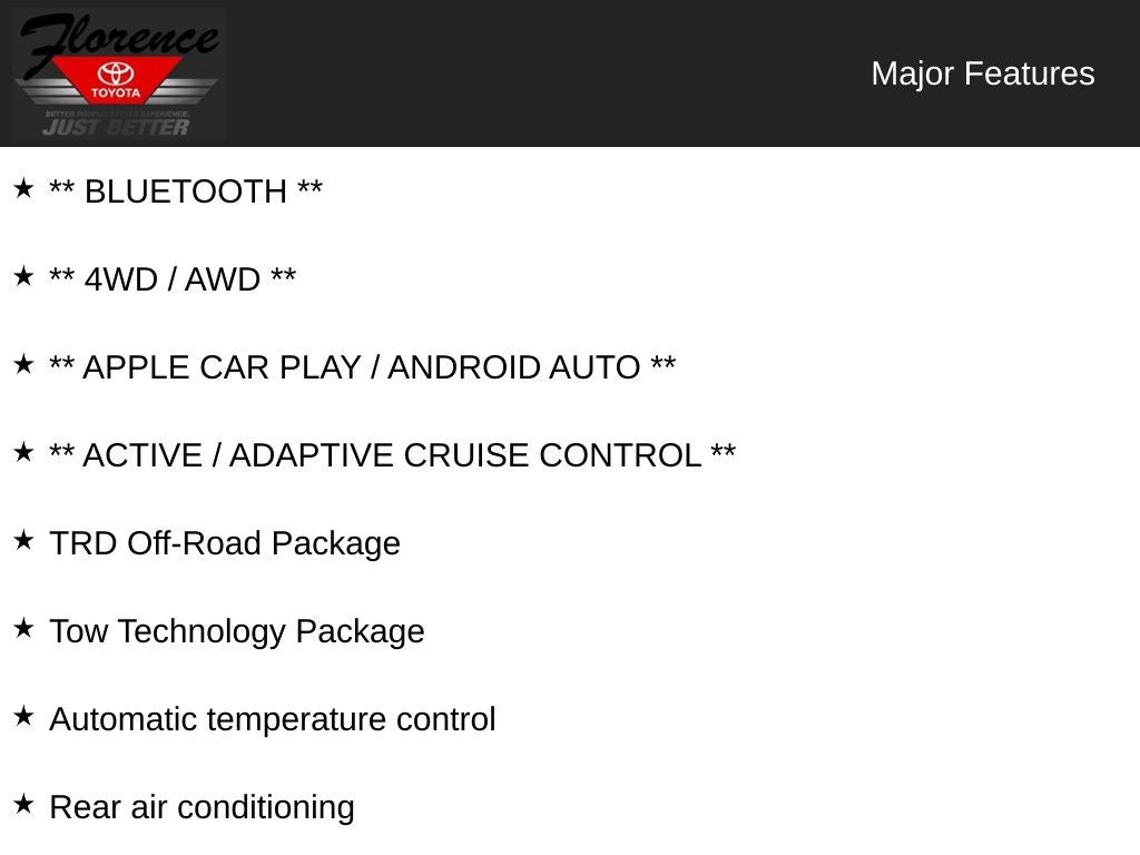 TRD Off-Road Package: P265/70R18 All-Terrain Tires; Multi-Terrain Back Monitor; 18" Black TRD Alloy Wheels. Offroad Front Skid Plate: Under Cover and Protector. Heated Leather Steering Wheel. Door Edge Guard. Wheel Locks. **Equipment listed is based on original vehicle build and subject to change. Please confirm the accuracy of the included equipment by calling the dealer prior to purchase.**