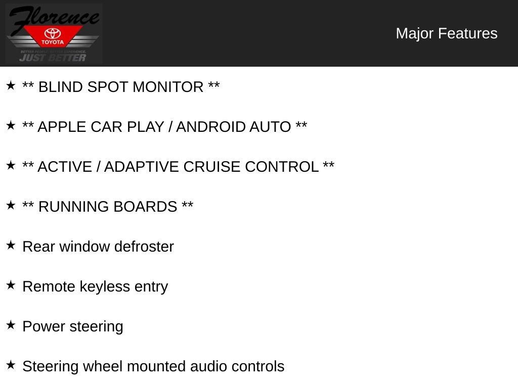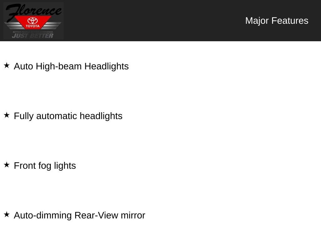 At Florence Toyota come see how our USED CARS are JUST BETTER. We offer the following benefits: Lifetime Power Train (Some exclusions apply), 1st Year Maintenance, $500 Additional Trade In Appraisal, 72 Hour Vehicle Exchange Program, Yearly Vehicle Appraisal & Safety Inspection, VIP Loyalty Program, Routine Express Service, Courtesy Service Shuttle, Express Buying Service. Also, as an added benefit we will buy your vehicle even if you don't buy ours!! Call today (866)830-0793 or visit us at www.florencetoyota.com *Customer must trade-in a vehicle to receive $1,000 Trade Assist credit that is included in the online price. **Financing must be provided by a third-party lender using this dealership's assistance for Customer to receive $1,000 Financing Assist credit that is included in the online price. See dealer for complete details.
