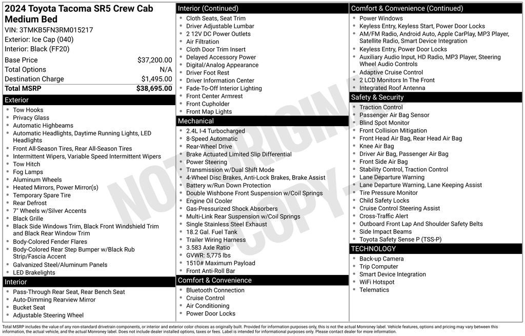 Discover the perfect blend of performance and versatility with this exceptional 2024 Toyota Tacoma SR5. Boasting a powerful 2.4L 4-Cylinder engine and an 8-Speed Automatic transmission, this truck delivers impressive efficiency with 21 MPG in the city and 26 MPG on the highway.